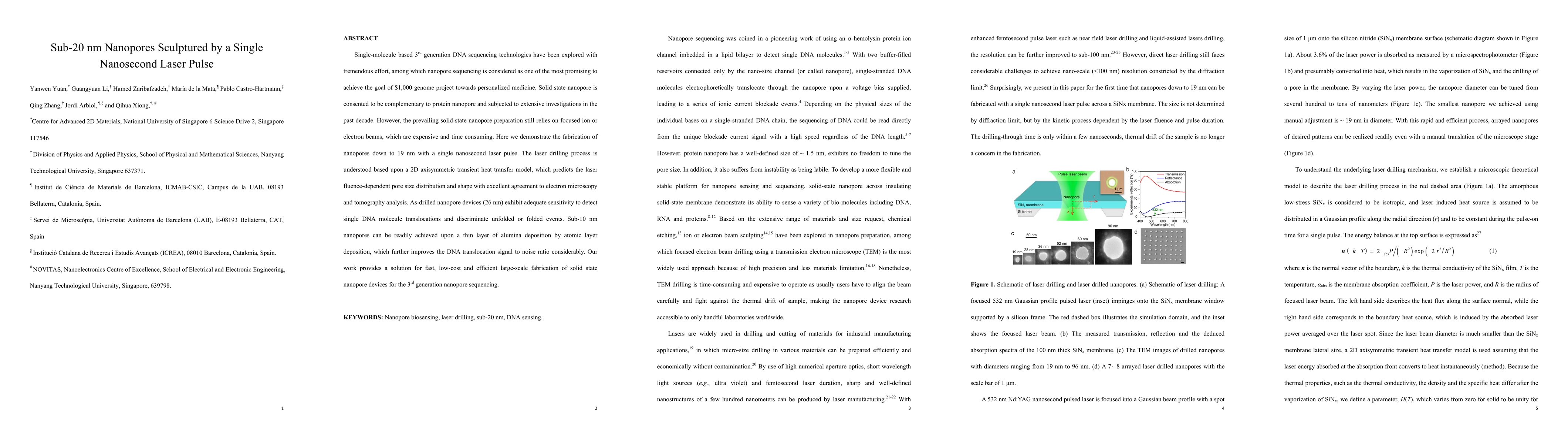 Single-molecule based 3rd generation DNA sequencing technologies have been explored with tremendous effort, among which nanopore sequencing is considered as one of the most promising to achieve the goal of $1,000 genome project towards personalized medicine. Solid state nanopore is consented to be complementary to protein nanopore and subjected to extensive investigations in the past decade. However, the prevailing solid-state nanopore preparation still relies on focused ion or electron beams, which are expensive and time consuming. Here we demonstrate the fabrication of nanopores down to 19 nm with a single nanosecond laser pulse. The laser drilling process is understood based upon a 2D axisymmetric transient heat transfer model, which predicts the laser fluence-dependent pore size distribution and shape with excellent agreement to electron microscopy and tomography analysis. As-drilled nanopore devices (26 nm) exhibit adequate sensitivity to detect single DNA molecule translocations and discriminate unfolded or folded events. Sub-10 nm nanopores can be readily achieved upon a thin layer of alumina deposition by atomic layer deposition, which further improves the DNA translocation signal to noise ratio considerably. Our work provides a solution for fast, low-cost and efficient large-scale fabrication of solid state nanopore devices for the 3rd generation nanopore sequencing.