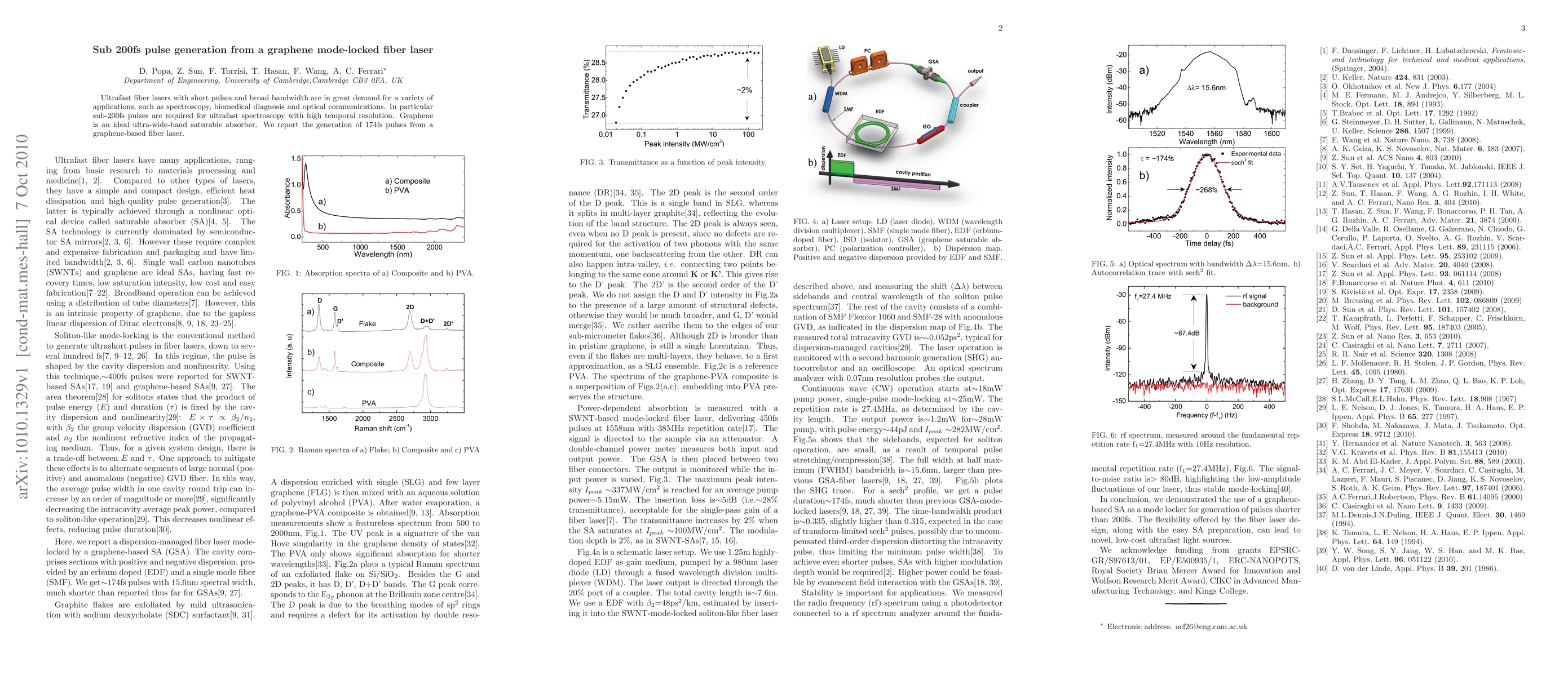 This paper reports the generation of ultrafast, 174 femtosecond pulses from a graphene mode-locked fiber laser, utilizing graphene's broad bandwidth and saturable absorption properties for applications in high-resolution spectroscopy and optical communications.