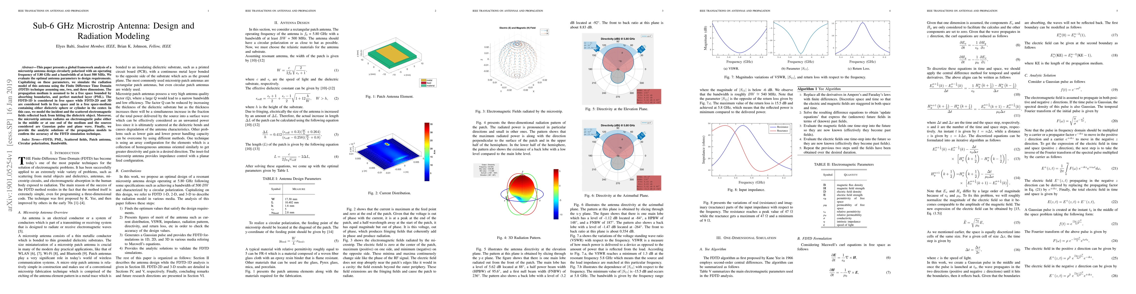 This paper presents a global framework analysis of a microstrip antenna design circularly polarized with an operating frequency of 5.80 GHz and a bandwidth of at least 500 MHz. We evaluate the optimal antenna parameters to design requirements. Capitalizing on these parameters, we simulate the radiation model of this antenna using the Finite Difference Time Domain (FDTD) technique assuming one, two, and three dimensions. The propagation medium is assumed to be a free space bounded by absorbing boundaries, and perfect matched layer (PML). The FDTD-1D is considered in free space while FDTD-2D and 3D are considered both in free space and in a free space-medium containing either dielectric sphere or cylinder in the center. In this case, we model the incident and the scattered electromagnetic fields reflected back from hitting the dielectric object. Moreover, the microstrip antenna radiates an electromagnetic pulse either in the middle or at one end of the medium and the sources considered are Gaussian pulse and plane wave. Finally, we provide the analytic solutions of the propagation models to confirm the accuracy of the FDTD simulation technique.