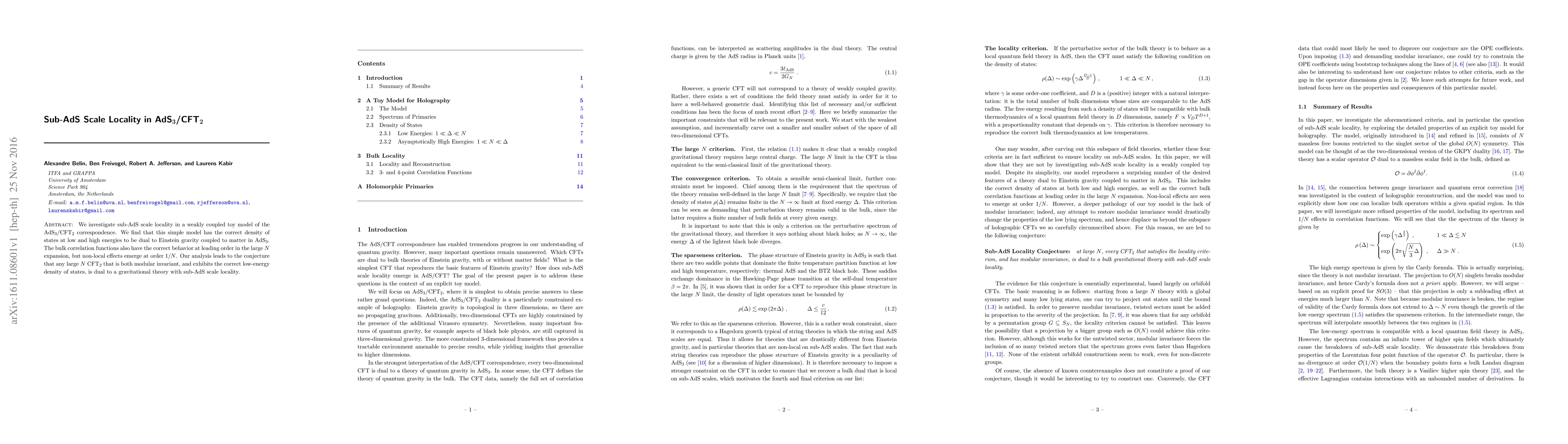We investigate sub-AdS scale locality in a weakly coupled toy model of the AdS$_3$/CFT$_2$ correspondence. We find that this simple model has the correct density of states at low and high energies to be dual to Einstein gravity coupled to matter in AdS$_3$. Bulk correlation functions also have the correct behavior at leading order in the large $N$ expansion, but non-local effects emerge at order $1/N$. Our analysis leads to the conjecture that any large $N$ CFT$_2$ that is modular invariant and has the right low-energy density of states is dual to a gravitational theory with sub-AdS scale locality.
