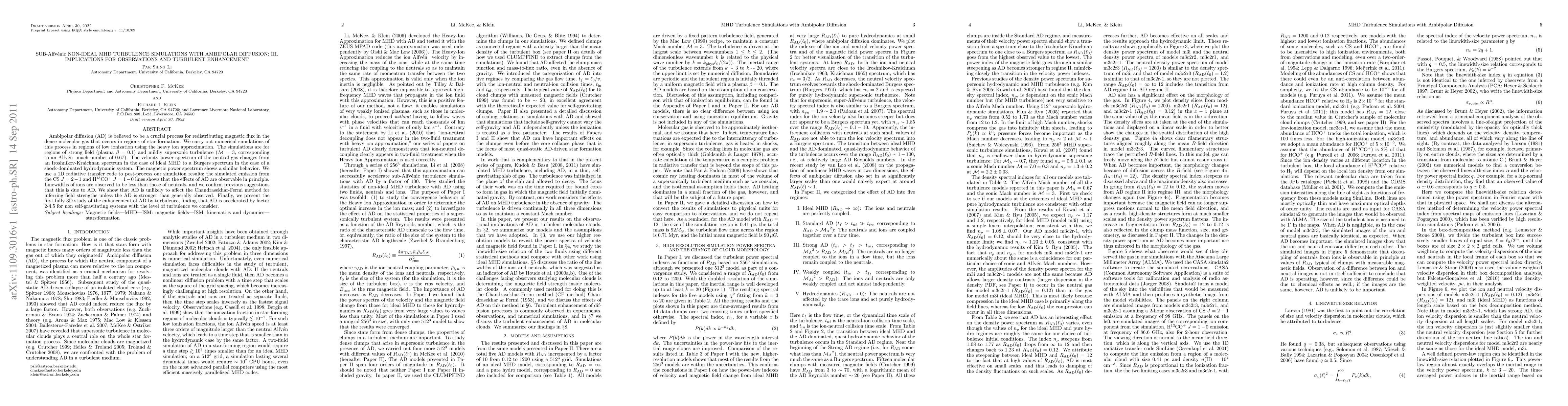 Ambipolar diffusion (AD) is believed to be a crucial process for redistributing magnetic flux in the dense molecular gas that occurs in regions of star formation. We carry out numerical simulations of this process in regions of low ionization using the heavy ion approximation. The simulations are for regions of strong field (plasma \beta=0.1) and mildly supersonic turbulence (M=3, corresponding to an Alfven mach number of 0.67). The velocity power spectrum of the neutral gas changes from an Iroshnikov-Kraichnan spectrum in the case of ideal MHD to a Burgers spectrum in the case of a shock-dominated hydrodynamic system. The magnetic power spectrum shows a similar behavior. We use a 1D radiative transfer code to post-process our simulation results; the simulated emission from the CS J=2-1 and H13CO+ J=1-0 lines shows that the effects of AD are observable in principle. Linewidths of ions are observed to be less than those of neutrals, and we confirm previous suggestions that this is due to AD. We show that AD is unlikely to affect the Chandrasekhar-Fermi method for inferring field strengths unless the AD is stronger than generally observed. Finally, we present the first fully 3D study of the enhancement of AD by turbulence, finding that AD is accelerated by factor 2-4.5 for non self-gravitating systems with the level of turbulence we consider.