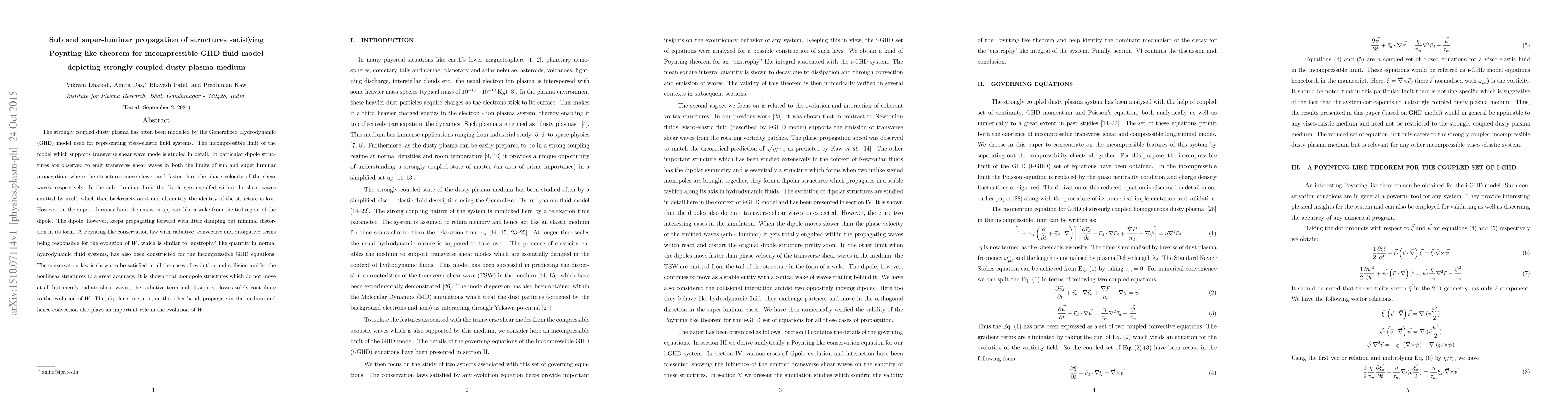 This paper investigates the propagation of dipole structures in strongly coupled dusty plasmas modeled by the incompressible Generalized Hydrodynamic (GHD) fluid model, observing both sub and super-luminal wave emissions. It constructs a Poynting-like conservation law for the evolution of a quantity analogous to enstrophy, demonstrating its accuracy in describing the dynamics of dipole and monopole structures.