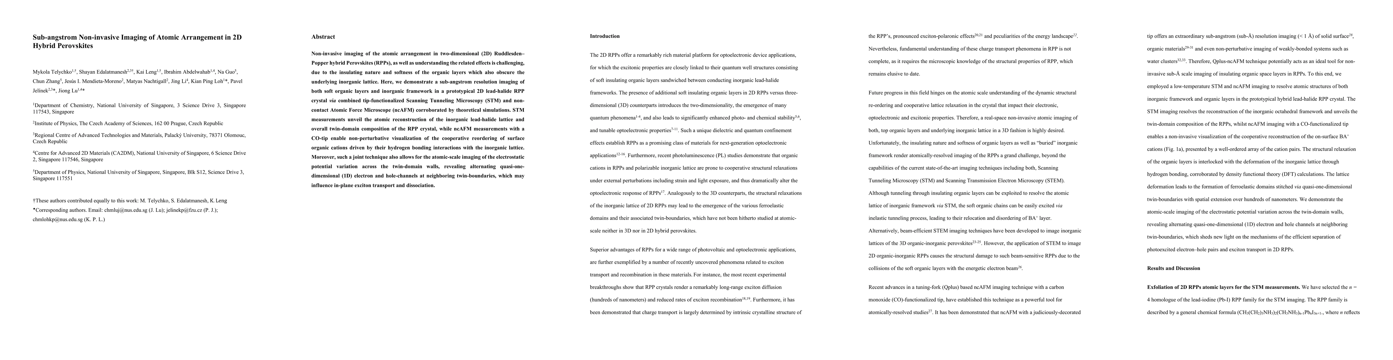 This paper presents sub-angstrom resolution imaging of a 2D hybrid perovskite crystal using combined STM and ncAFM, revealing atomic structure and electrostatic potential variations, including twin-domain composition and electron/hole-channel formation at twin boundaries. The study highlights the cooperative reordering of organic layers via hydrogen bonding and its impact on exciton transport.