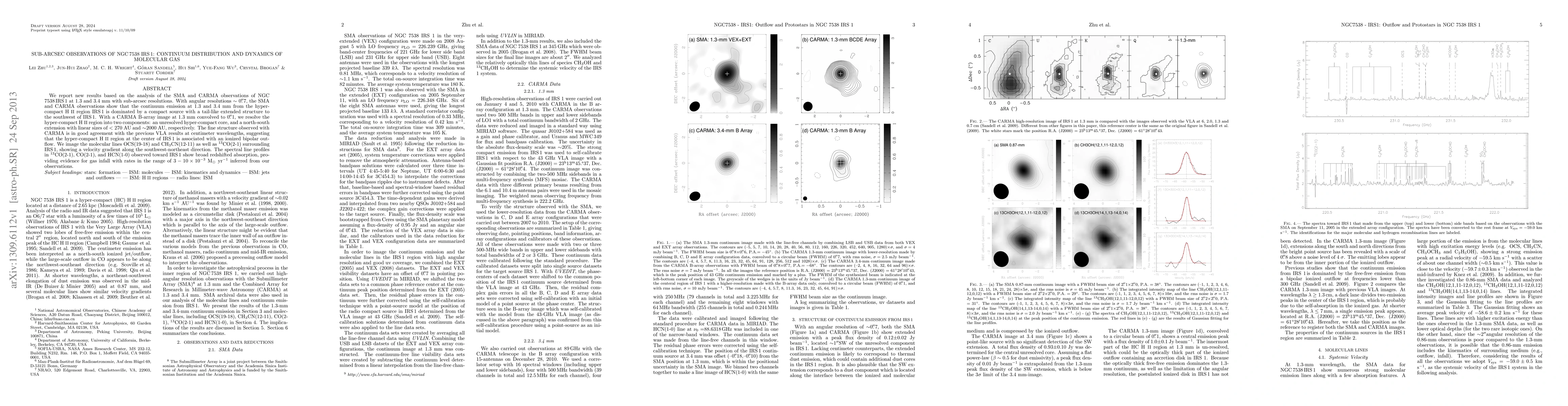 The paper presents high-resolution observations of NGC 7538 IRS 1 using SMA and CARMA at 1.3 and 3.4 mm, revealing a compact continuum source with a southwest tail. The data shows an unresolved hyper-compact core and a north-south extension of ~270 AU and ~2000 AU, respectively. Molecular lines indicate a velocity gradient and gas infall, supporting the presence of an ionized bipolar outflow associated with the hyper-compact H2 region at IRS 1.
