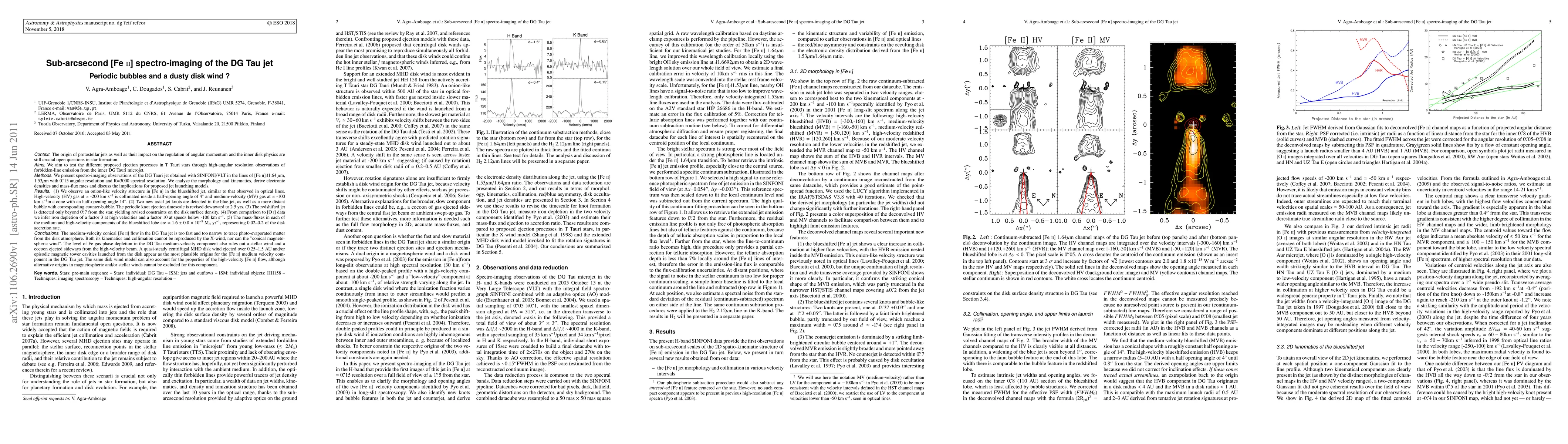 Researchers observed a complex jet structure in DG Tau with periodic bubbles and high-velocity gas, finding that a disk wind model best explains the data, while alternative origins remain possible for the high-velocity component.