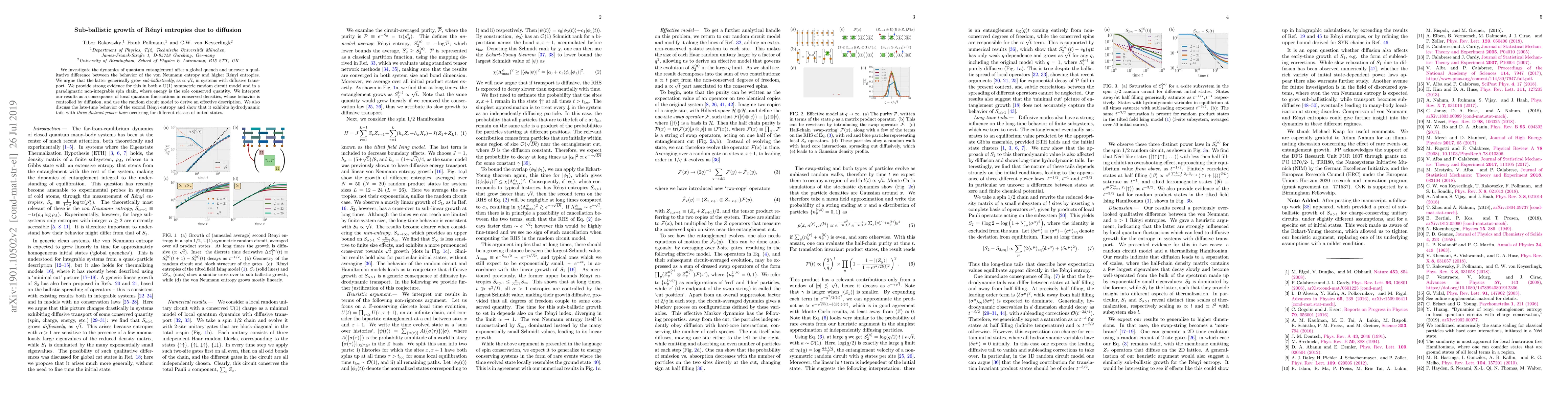 This paper explores the dynamics of quantum entanglement post-quench, revealing that higher Rényi entropies grow sub-ballistically, proportional to $\sqrt{t}$, in systems with diffusive transport. The findings are demonstrated in both a U(1) symmetric random circuit model and a non-integrable spin chain, attributing the behavior to local quantum fluctuations in conserved densities.