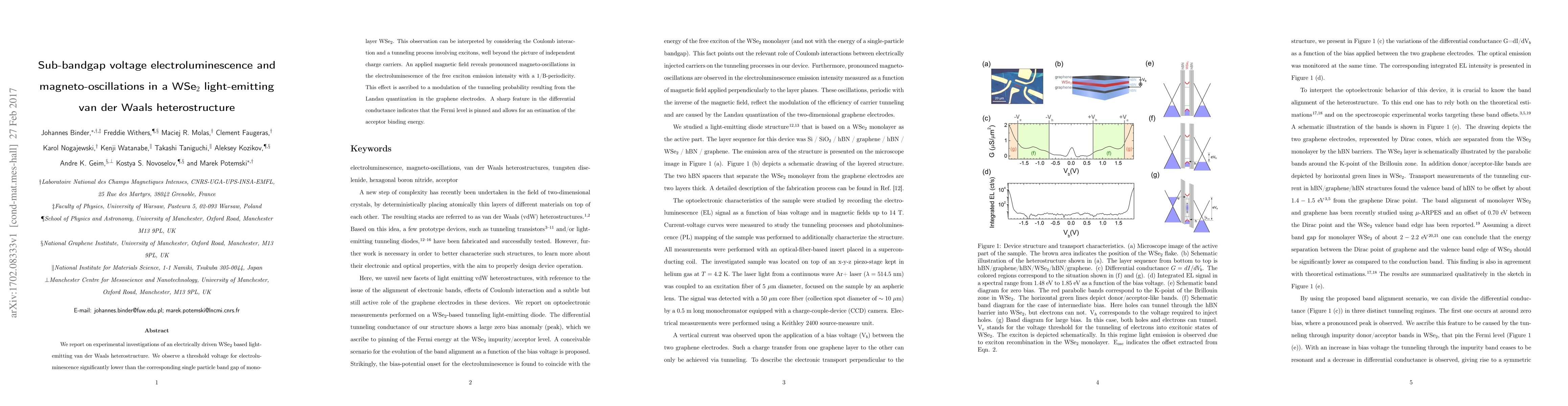 We report on experimental investigations of an electrically driven WSe2 based light-emitting van der Waals heterostructure. We observe a threshold voltage for electroluminescence significantly lower than the corresponding single particle band gap of monolayer WSe2. This observation can be interpreted by considering the Coulomb interaction and a tunneling process involving excitons, well beyond the picture of independent charge carriers. An applied magnetic field reveals pronounced magneto-oscillations in the electroluminescence of the free exciton emission intensity with a 1/B-periodicity. This effect is ascribed to a modulation of the tunneling probability resulting from the Landau quantization in the graphene electrodes. A sharp feature in the differential conductance indicates that the Fermi level is pinned and allows for an estimation of the acceptor binding energy.