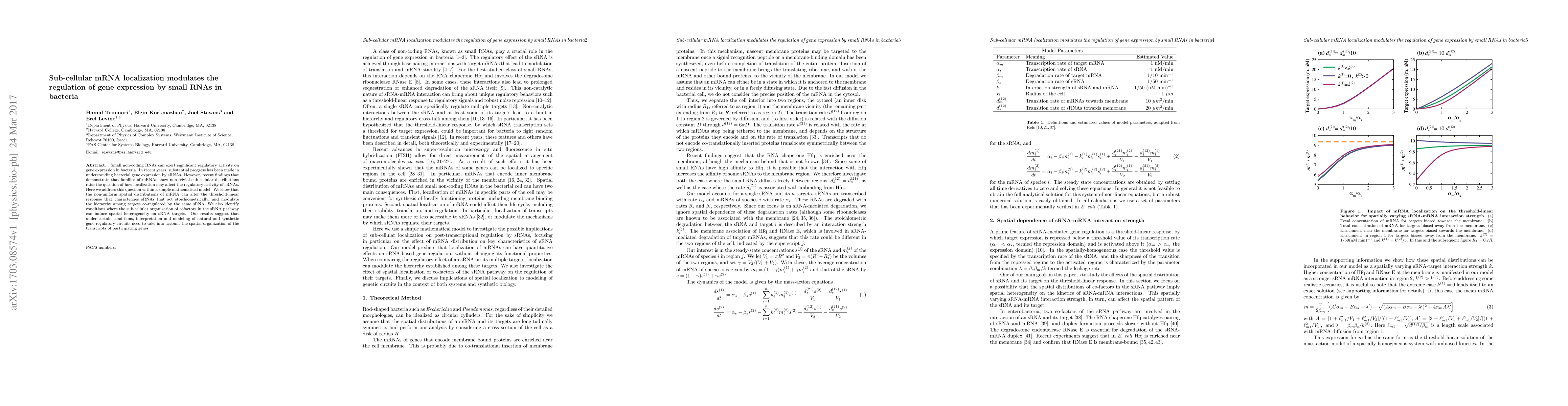 Small non-coding RNAs can exert significant regulatory activity on gene expression in bacteria. In recent years, substantial progress has been made in understanding bacterial gene expression by sRNAs. However, recent findings that demonstrate that families of mRNAs show non-trivial sub-cellular distributions raise the question of how localization may affect the regulatory activity of sRNAs. Here we address this question within a simple mathematical model. We show that the non-uniform spatial distributions of mRNA can alter the threshold-linear response that characterizes sRNAs that act stoichiometrically, and modulate the hierarchy among targets co-regulated by the same sRNA. We also identify conditions where the sub-cellular organization of cofactors in the sRNA pathway can induce spatial heterogeneity on sRNA targets. Our results suggest that under certain conditions, interpretation and modeling of natural and synthetic gene regulatory circuits need to take into account the spatial organization of the transcripts of participating genes.