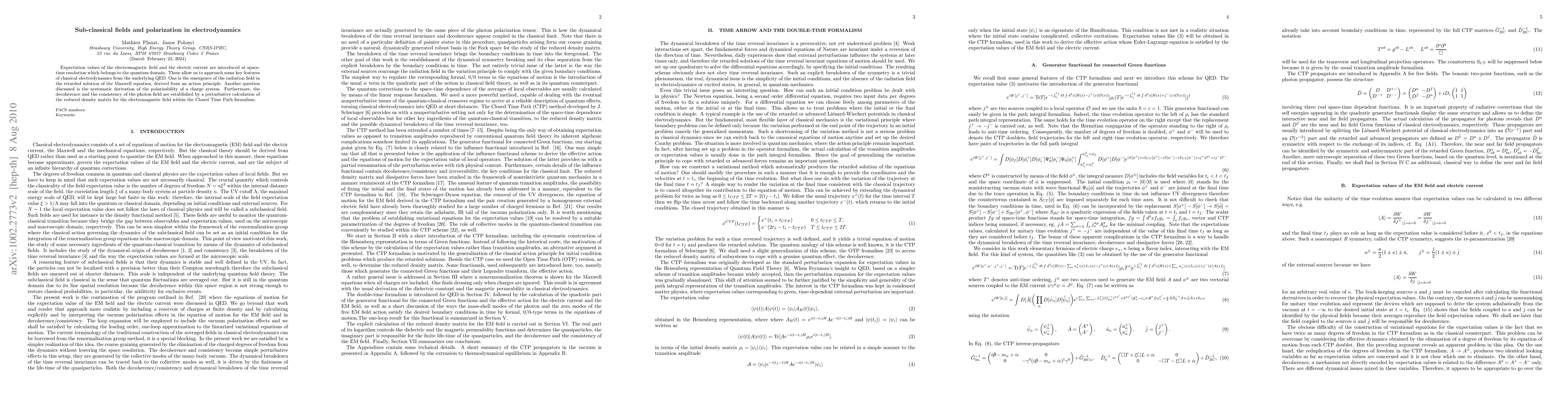 Expectation values of the electromagnetic field and the electric current are introduced at space-time resolution which belongs to the quantum domain. These allow us to approach some key features of classical electrodynamics from the underlying QED. One is the emergence of the radiation field in the retarded solution of the Maxwell equation, derived from an action principle. Another question discussed is the systematic derivation of the polarizability of a charge system. Furthermore, the decoherence and the consistency of the photon field is established by a perturbative calculation of the reduced density matrix for the electromagnetic field within the Closed Time Path formalism.