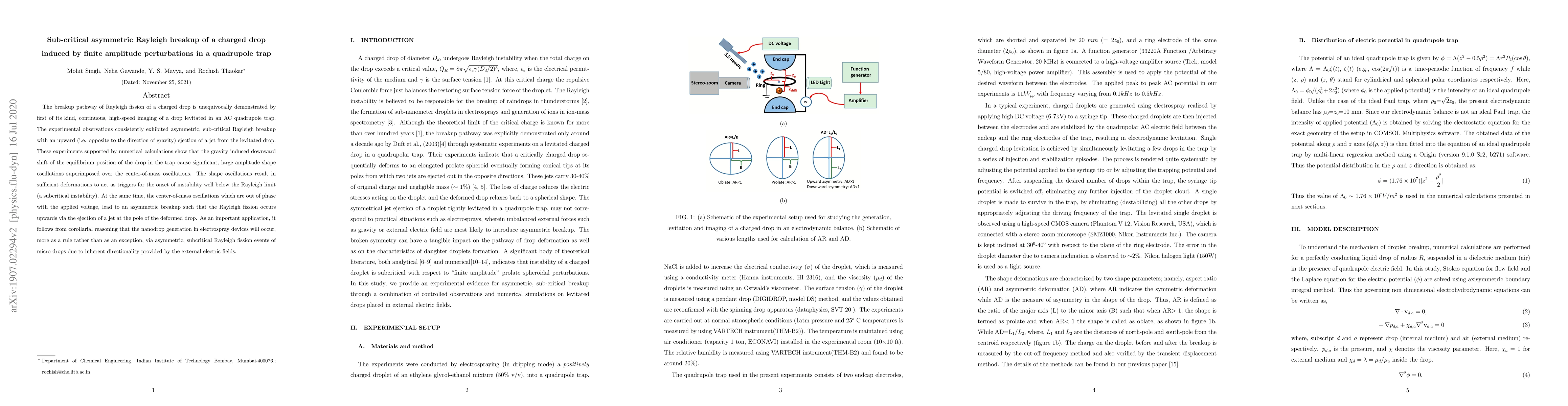 This study demonstrates the asymmetric, sub-critical Rayleigh breakup of a charged drop in an AC quadrupole trap, revealing upward jet ejection via high-speed imaging and numerical simulations. The findings suggest that gravity-induced deformations trigger instability below the Rayleigh limit, leading to asymmetric breakup due to out-of-phase center-of-mass oscillations.