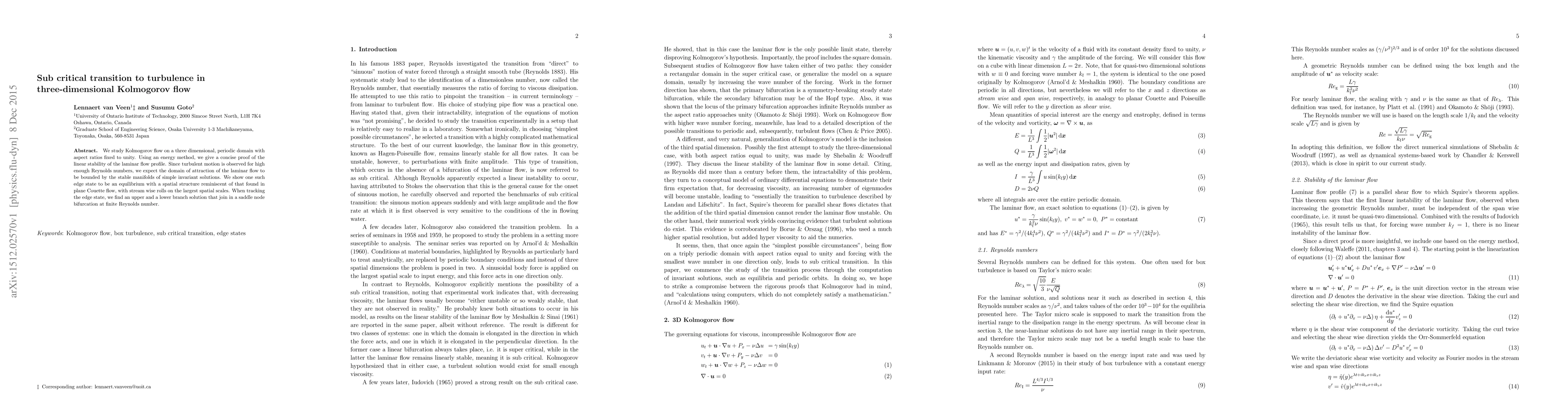 We study Kolmogorov flow on a three dimensional, periodic domain with aspect ratios fixed to unity. Using an energy method, we give a concise proof of the linear stability of the laminar flow profile. Since turbulent motion is observed for high enough Reynolds numbers, we expect the domain of attraction of the laminar flow to be bounded by the stable manifolds of simple invariant solutions. We show one such edge state to be an equilibrium with a spatial structure reminiscent of that found in plane Couette flow, with stream wise rolls on the largest spatial scales. When tracking the edge state, we find an upper and a lower branch solution that join in a saddle node bifurcation at finite Reynolds number.