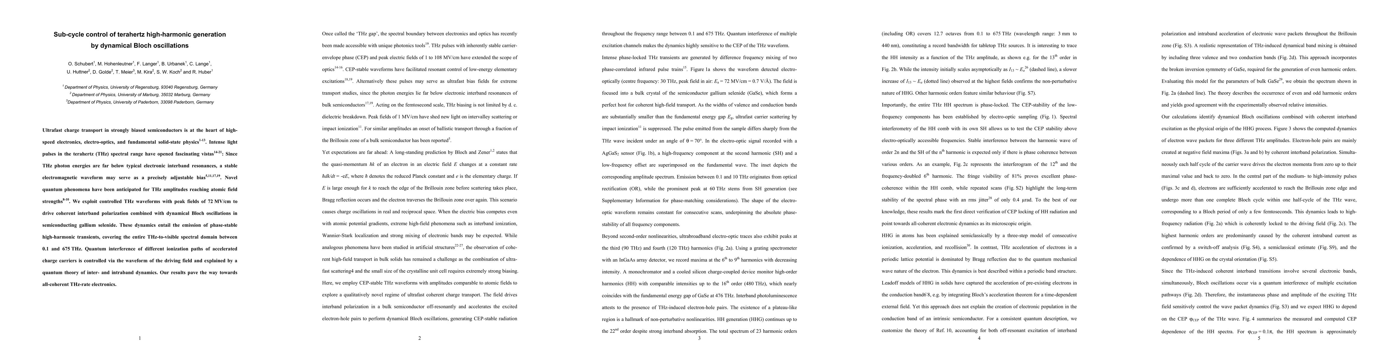 Ultrafast charge transport in strongly biased semiconductors is at the heart of highspeed electronics, electro-optics, and fundamental solid-state physics. Intense light pulses in the terahertz (THz) spectral range have opened fascinating vistas: Since THz photon energies are far below typical electronic interband resonances, a stable electromagnetic waveform may serve as a precisely adjustable bias. Novel quantum phenomena have been anticipated for THz amplitudes reaching atomic field strengths. We exploit controlled THz waveforms with peak fields of 72 MV/cm to drive coherent interband polarization combined with dynamical Bloch oscillations in semiconducting gallium selenide. These dynamics entail the emission of phase-stable high-harmonic transients, covering the entire THz-to-visible spectral domain between 0.1 and 675 THz. Quantum interference of different ionization paths of accelerated charge carriers is controlled via the waveform of the driving field and explained by a quantum theory of inter- and intraband dynamics. Our results pave the way towards all-coherent THz-rate electronics.