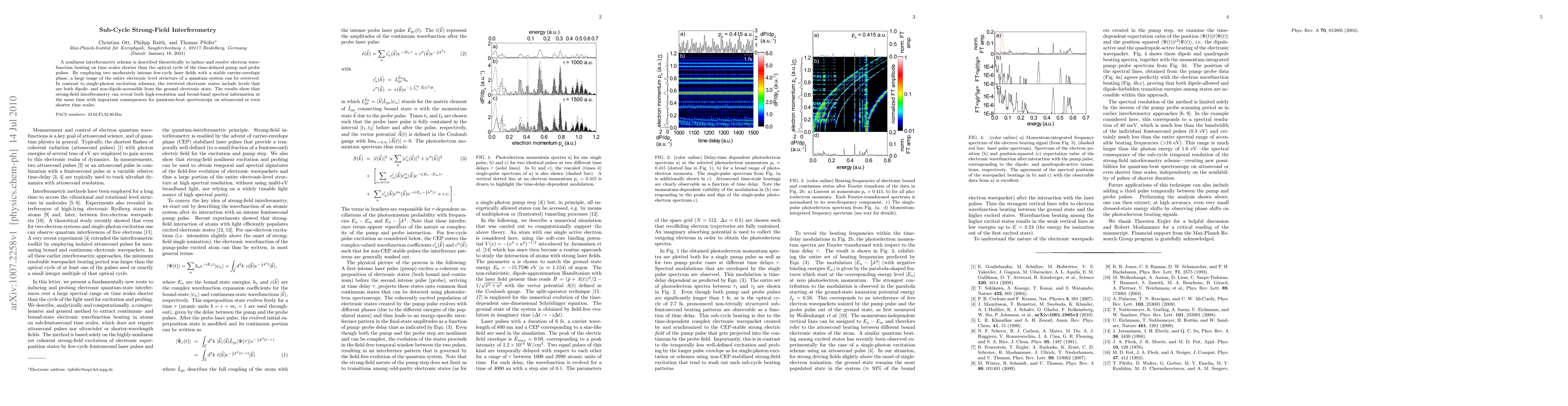 A nonlinear interferometry scheme is described theoretically to induce and resolve electron wave- function beating on time scales shorter than the optical cycle of the time-delayed pump and probe pulses. By employing two moderately intense few-cycle laser fields with a stable carrier-envelope phase, a large range of the entire electronic level structure of a quantum system can be retrieved. In contrast to single-photon excitation schemes, the retrieved electronic states include levels that are both dipole- and non-dipole-accessible from the ground electronic state. The results show that strong-field interferometry can reveal both high-resolution and broad-band spectral information at the same time with important consequences for quantum-beat spectroscopy on attosecond or even shorter time scales.