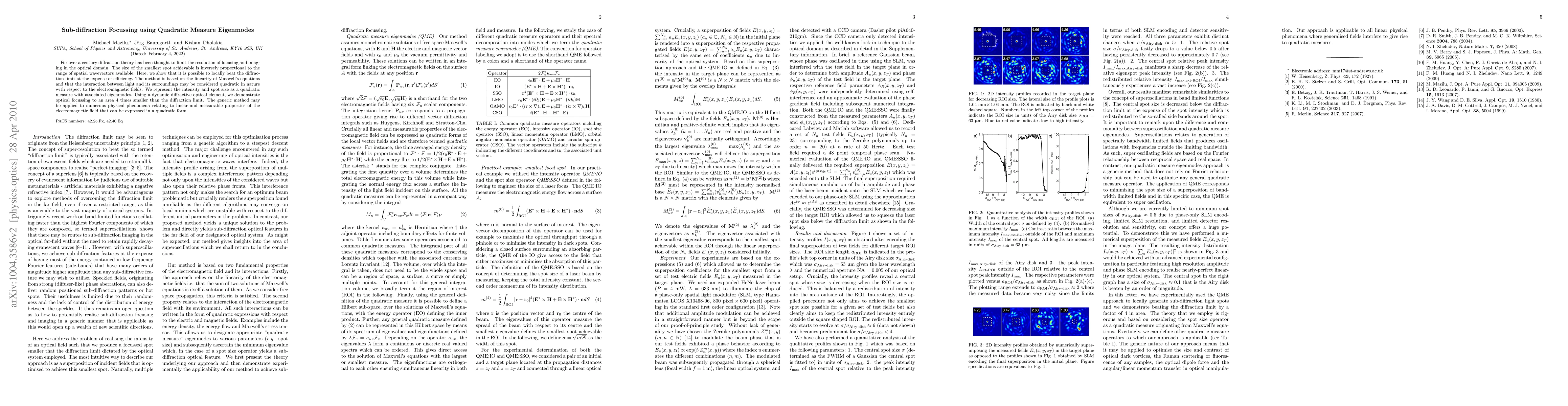 For over a century diffraction theory has been thought to limit the resolution of focusing and imaging in the optical domain. The size of the smallest spot achievable is inversely proportional to the range of spatial wavevectors available. Here, we show that it is possible to locally beat the diffraction limit at the expense of efficiency. The method is based on the linearity of Maxwell's equations and that the interaction between light and its surroundings may be considered quadratic in nature with respect to the electromagnetic fields. We represent the intensity and spot size as a quadratic measure with associated eigenmodes. Using a dynamic diffractive optical element, we demonstrate optical focussing to an area 4 times smaller than the diffraction limit. The generic method may be applied to numerous physical phenomena relating to linear and measurable properties of the electromagnetic field that can be expressed in a quadratic form.