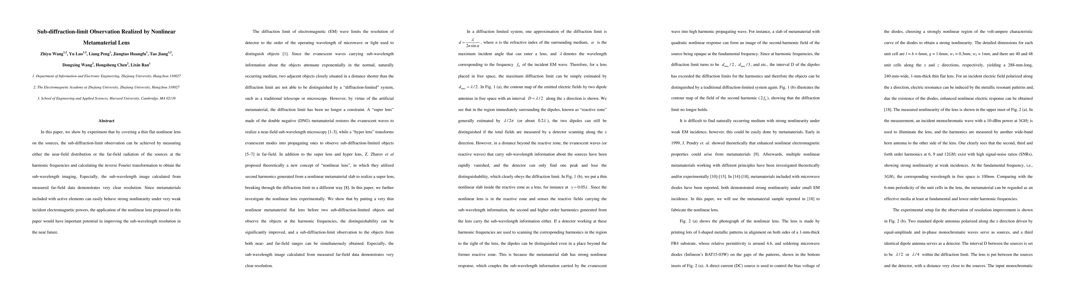This research demonstrates the achievement of sub-diffraction-limit observation using a thin nonlinear lens, measuring near-field or far-field data at harmonic frequencies and applying inverse Fourier transformation for sub-wavelength imaging. The method, utilizing metamaterials with active elements for strong nonlinearity under weak electromagnetic powers, holds promise for enhancing sub-wavelength resolution in future applications.