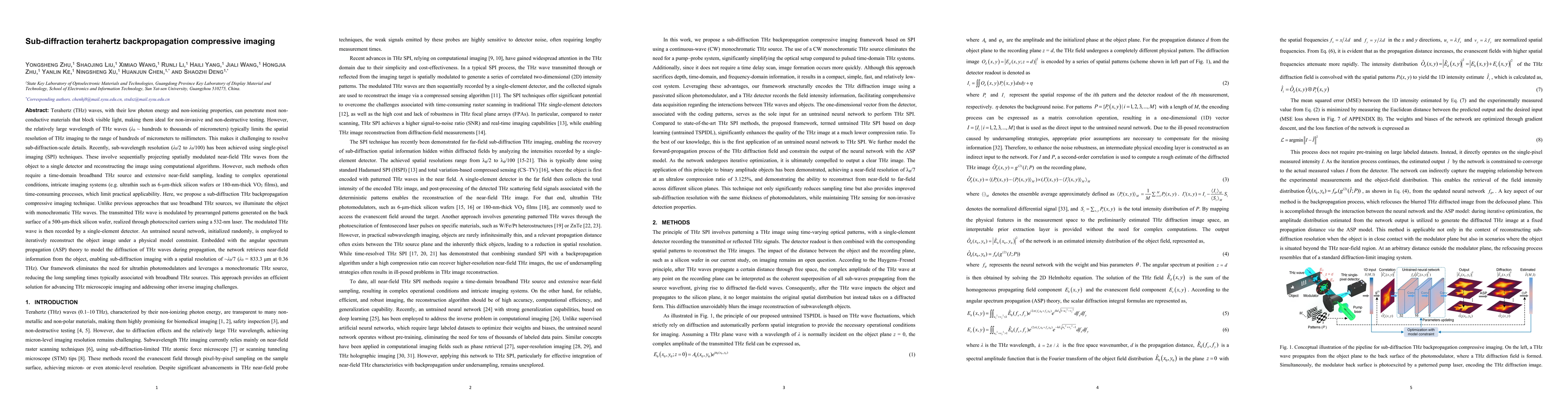 The research proposes a sub-diffraction THz backpropagation compressive imaging technique. It uses monochromatic continuous-wave THz radiation illuminating the object, with the transmitted THz wave modulated by patterns on a silicon wafer's back surface generated via a 532-nm laser. The modulated THz wave is recorded by a single-element detector, and an untrained neural network reconstructs the object image with an ultralow compression ratio of 1.5625% under physical model constraints.