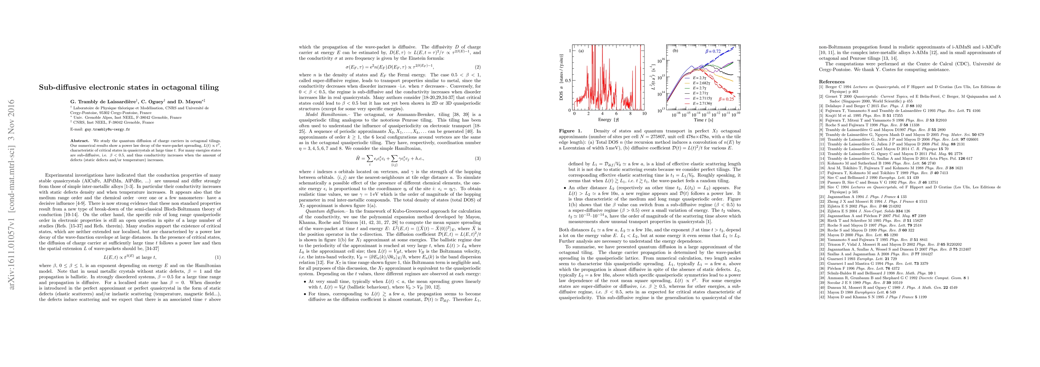 This paper investigates quantum diffusion in octagonal tilings, revealing sub-diffusive charge carrier behavior with a power law decay, indicating increased conductivity with higher defect levels. The findings suggest critical states in quasicrystals characterized by a non-standard diffusion rate.