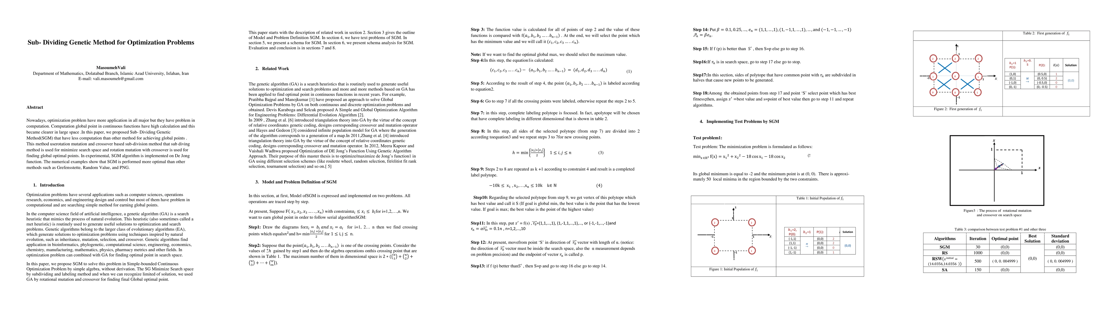 Nowadays, optimization problem have more application in all major but they have problem in computation. Computation global point in continuous functions have high calculation and this became clearer in large space .In this paper, we proposed Sub- Dividing Genetic Method(SGM) that have less computation than other method for achieving global points . This method userotation mutation and crossover based sub-division method that sub diving method is used for minimize search space and rotation mutation with crossover is used for finding global optimal points. In experimental, SGM algorithm is implemented on De Jong function. The numerical examples show that SGM is performed more optimal than other methods such as Grefensstette, Random Value, and PNG.
