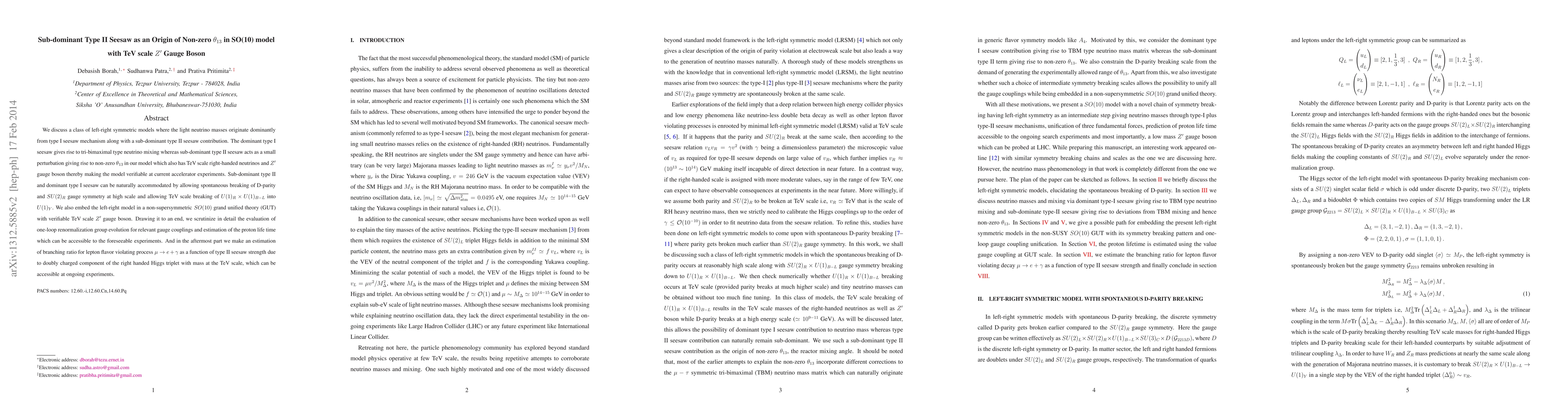 We discuss a class of left-right symmetric models where the light neutrino masses originate dominantly from type I seesaw mechanism along with a sub-dominant type II seesaw contribution. The dominant type I seesaw gives rise to tri-bimaximal type neutrino mixing whereas sub-dominant type II seesaw acts as a small perturbation giving rise to non-zero $\theta_{13}$ in our model which also has TeV scale right-handed neutrinos and $Z^\prime$ gauge boson thereby making the model verifiable at current accelerator experiments. Sub-dominant type II and dominant type I seesaw can be naturally accommodated by allowing spontaneous breaking of D-parity and $SU(2)_R$ gauge symmetry at high scale and allowing TeV scale breaking of $U(1)_{R} \times U(1)_{B-L}$ into $U(1)_Y$. We also embed the left-right model in a non-supersymmetric $SO(10)$ grand unified theory (GUT) with verifiable TeV scale $Z^\prime$ gauge boson. Drawing it to an end, we scrutinize in detail the evaluation of one-loop renormalization group evolution for relevant gauge couplings and estimation of the proton life time which can be accessible to the foreseeable experiments. And in the aftermost part we make an estimation of branching ratio for lepton flavor violating process $\mu \rightarrow e + \gamma $ as a function of type II seesaw strength due to doubly charged component of the right handed Higgs triplet with mass at the TeV scale, which can be accessible at ongoing experiments.