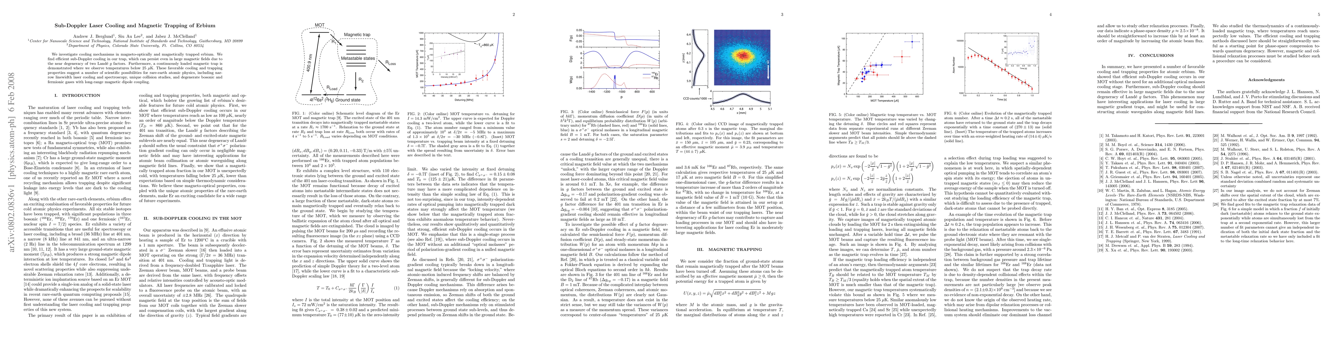 This study demonstrates sub-Doppler laser cooling and magnetic trapping of erbium atoms, achieving temperatures below 25 microkelvin in a continuously loaded magnetic trap. The near degeneracy of Lande g factors enables efficient cooling even in large magnetic fields, opening avenues for rare-earth atomic physics applications.