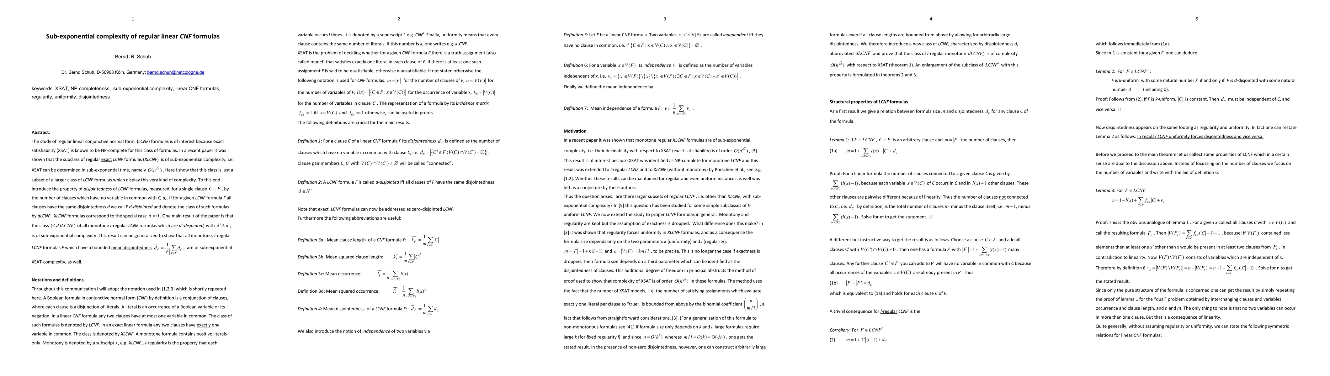 The study of regular linear conjunctive normal form (LCNF) formulas is of interest because exact satisfiability (XSAT) is known to be NP-complete for this class of formulas. In a recent paper it was shown that the subclass of regular exact LCNF formulas (XLCNF) is of sub-exponential complexity, i.e. XSAT can be determined in sub-exponential time. Here I show that this class is just a subset of a larger class of LCNF formulas which display this very kind of complexity. To this end I introduce the property of disjointedness of LCNF formulas, measured, for a single clause C, by the number of clauses which have no variable in common with C. If for a given LCNF formula F all clauses have the same disjointedness d we call F d-disjointed and denote the class of such formulas by dLCNF. XLCNF formulas correspond to the special cased=0. One main result of the paper is that the class of all monotone l-regular LCNF formulas which are d-disjointed, with d smaller than some upper bound D, is of sub-exponential complexity. This result can be generalized to show that all monotone, l-regular LCNF formulas F which have a bounded mean disjointedness, are of sub-exponential XSAT-complexity, as well.
