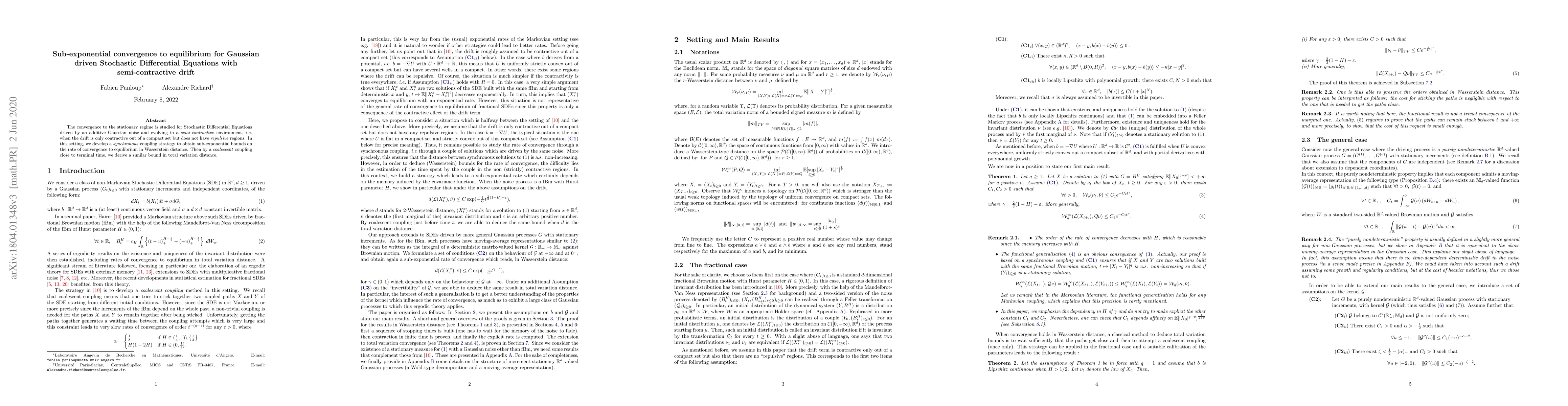 The convergence to the stationary regime is studied for Stochastic Differential Equations driven by an additive Gaussian noise and evolving in a semi-contractive environment, i.e. when the drift is only contractive out of a compact set but does not have repulsive regions. In this setting, we develop a synchronous coupling strategy to obtain sub-exponential bounds on the rate of convergence to equilibrium in Wasserstein distance. Then by a coalescent coupling close to terminal time, we derive a similar bound in total variation distance.