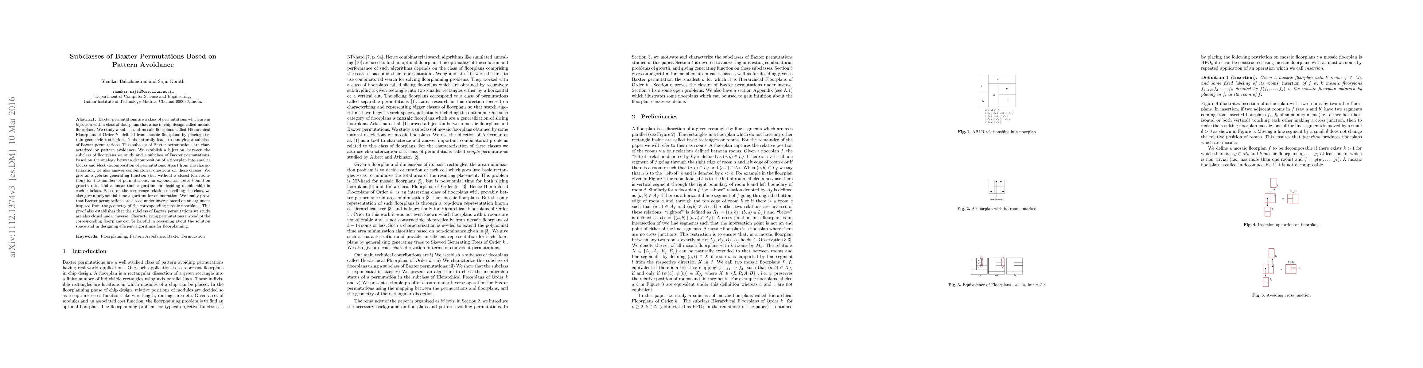 Researchers study a subclass of Baxter permutations based on pattern avoidance, establishing a bijection with a corresponding class of floorplans and providing combinatorial questions, generating functions, and algorithms for analysis and enumeration.