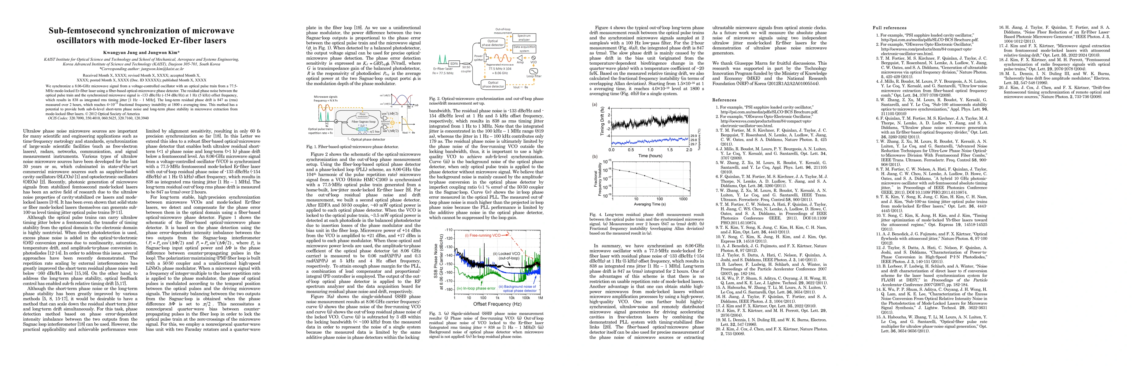 This paper details the synchronization of a 8.06-GHz microwave oscillator with a 77.5-MHz mode-locked Er-fiber laser, achieving sub-femtosecond timing precision and demonstrating a residual phase noise of -133 dBc/Hz at 1 Hz offset. The long-term phase stability reaches 4×10^-19 fractional frequency instability over 1800 seconds.