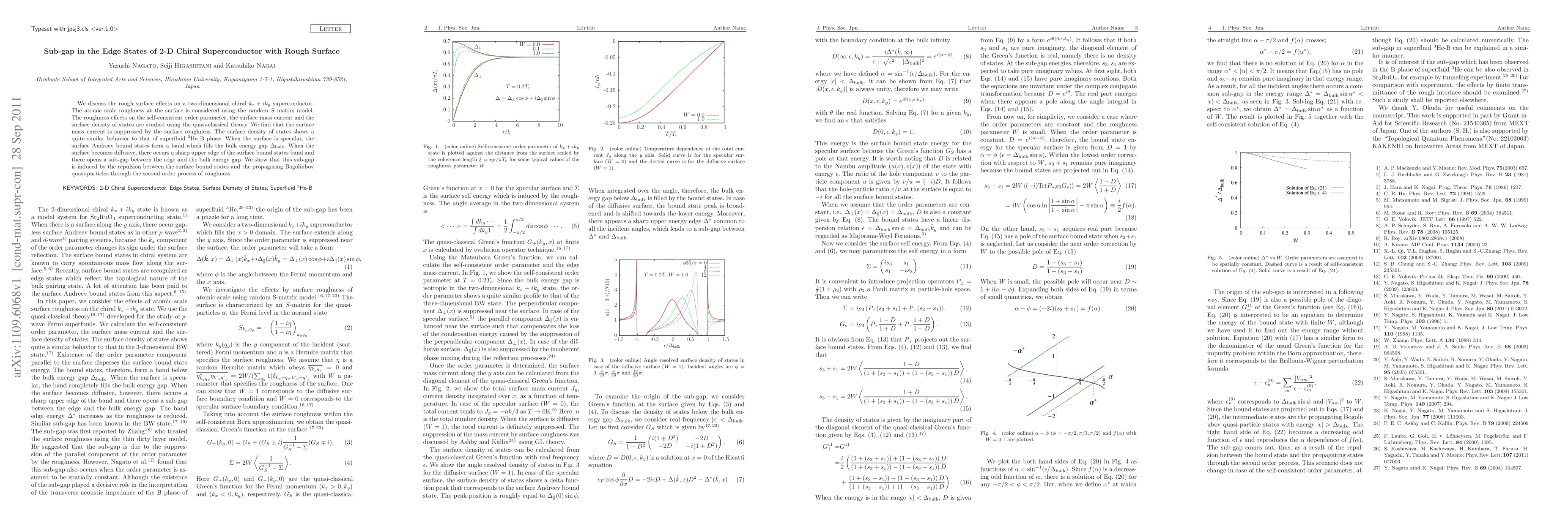 This paper investigates the impact of rough surfaces on the properties of a two-dimensional chiral superconductor, revealing that surface roughness suppresses the surface mass current and induces a sub-gap in the edge states, similar to the behavior observed in superfluid ${}^3$He B phase. The sub-gap arises due to repulsion between surface bound states and propagating quasi-particles via roughness-induced processes.