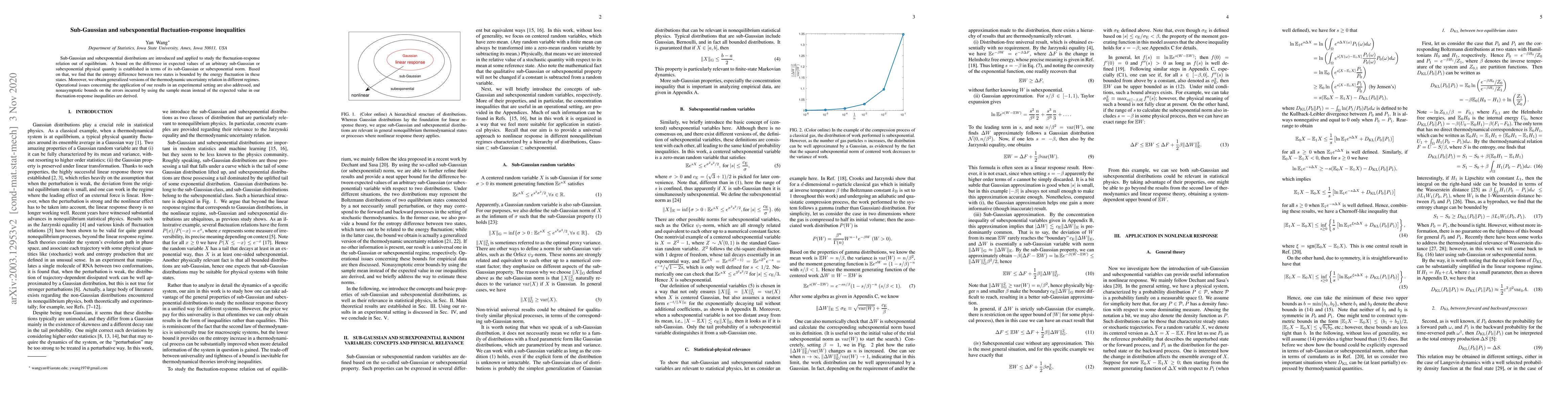 Sub-Gaussian and subexponential distributions are introduced and applied to study the fluctuation-response relation out of equilibrium. A bound on the difference in expected values of an arbitrary sub-Gaussian or subexponential physical quantity is established in terms of its sub-Gaussian or subexponential norm. Based on that, we find that the entropy difference between two states is bounded by the energy fluctuation in these states. Moreover, we obtain generalized versions of the thermodynamic uncertainty relation in different regimes. Operational issues concerning the application of our results in an experimental setting are also addressed, and nonasymptotic bounds on the errors incurred by using the sample mean instead of the expected value in our fluctuation-response inequalities are derived.