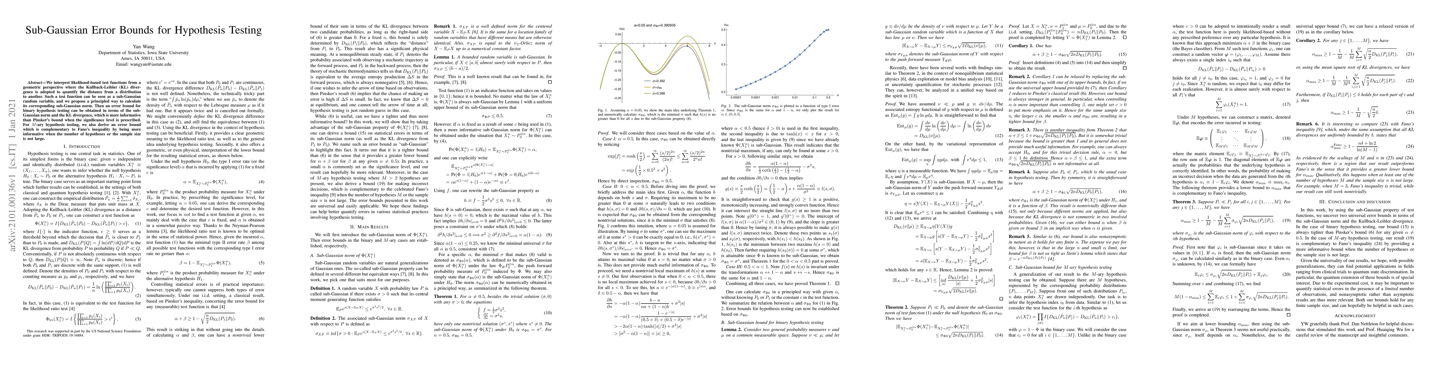 We interpret likelihood-based test functions from a geometric perspective where the Kullback-Leibler (KL) divergence is adopted to quantify the distance from a distribution to another. Such a test function can be seen as a sub-Gaussian random variable, and we propose a principled way to calculate its corresponding sub-Gaussian norm. Then an error bound for binary hypothesis testing can be obtained in terms of the sub-Gaussian norm and the KL divergence, which is more informative than Pinsker's bound when the significance level is prescribed. For $M$-ary hypothesis testing, we also derive an error bound which is complementary to Fano's inequality by being more informative when the number of hypotheses or the sample size is not large.