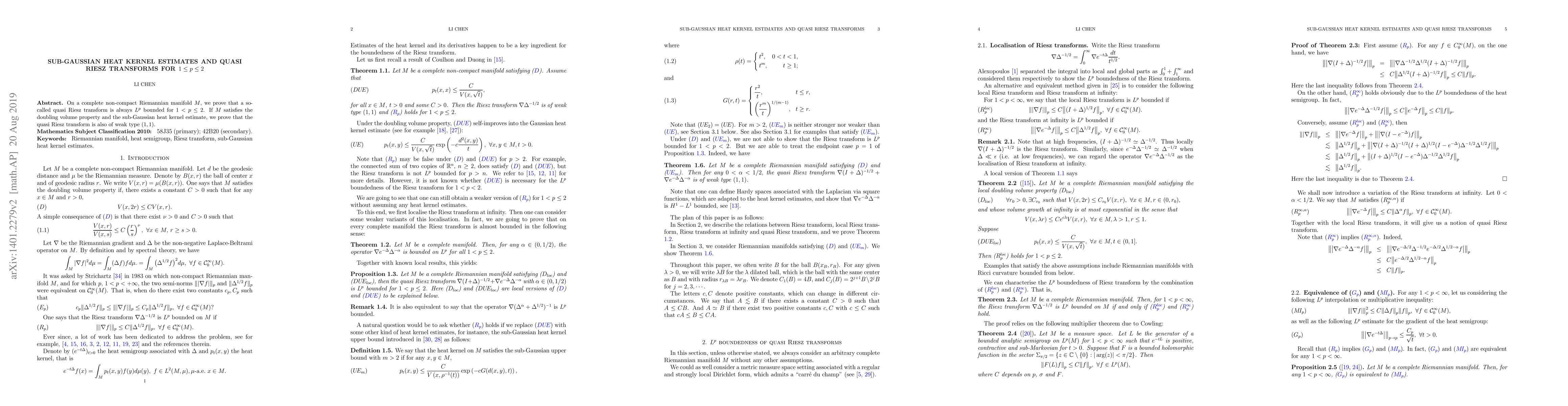 This paper proves $L^p$ boundedness for quasi Riesz transforms on complete non-compact Riemannian manifolds for $1<p\leq 2$. Additionally, under the conditions of doubling volume and sub-Gaussian heat kernel estimates, it establishes weak type $(1,1)$ boundedness for these transforms.