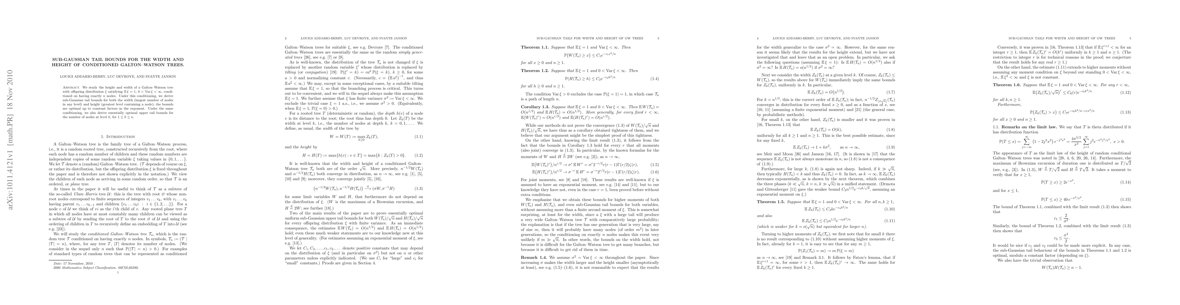We study the height and width of a Galton--Watson tree with offspring distribution B satisfying E(B)=1, 0 < Var(B) < infinity, conditioned on having exactly n nodes. Under this conditioning, we derive sub-Gaussian tail bounds for both the width (largest number of nodes in any level) and height (greatest level containing a node); the bounds are optimal up to constant factors in the exponent. Under the same conditioning, we also derive essentially optimal upper tail bounds for the number of nodes at level k, for 1 <= k <= n.