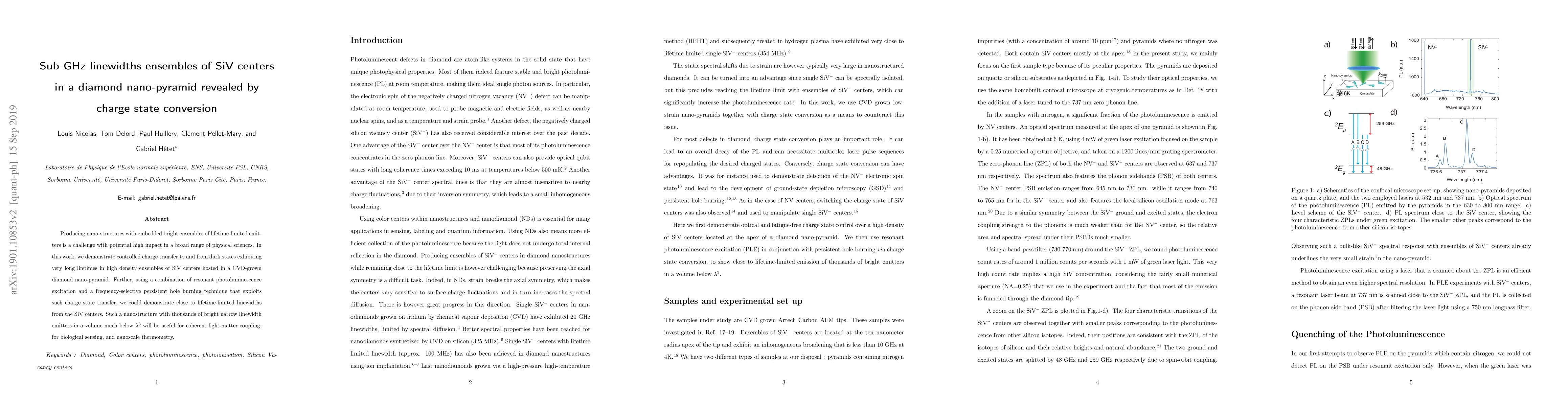Producing nano-structures with embedded bright ensembles of lifetime-limited emitters is a challenge with potential high impact in a broad range of physical sciences. In this work, we demonstrate controlled charge transfer to and from dark states exhibiting very long lifetimes in high density ensembles of SiV centers hosted in a CVD-grown diamond nano-pyramid. Further, using a combination of resonant photoluminescence excitation and a frequency-selective persistent hole burning technique that exploits such charge state transfer, we could demonstrate close to lifetime-limited linewidths from the SiV centers. Such a nanostructure with thousands of bright narrow linewidth emitters in a volume much below $\lambda^3$ will be useful for coherent light-matter coupling, for biological sensing, and nanoscale thermometry.