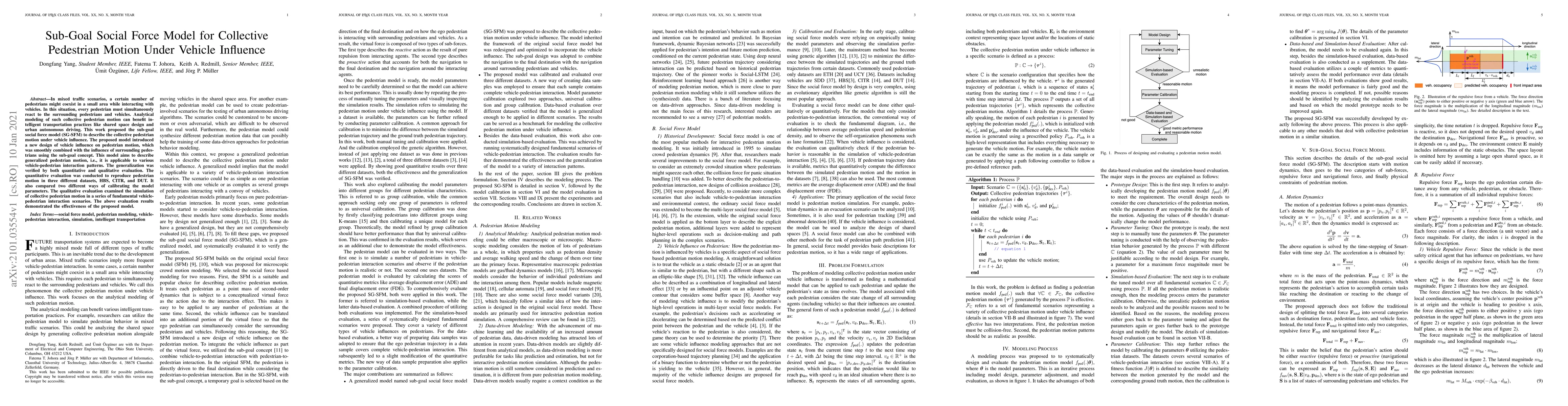 This paper proposes a sub-goal social force model (SG-SFM) to describe collective pedestrian motion in mixed traffic scenarios, integrating vehicle influence with pedestrian interactions. The model was validated through quantitative and qualitative evaluations across various datasets, demonstrating its effectiveness in simulating pedestrian behavior under different vehicle-pedestrian interaction patterns.