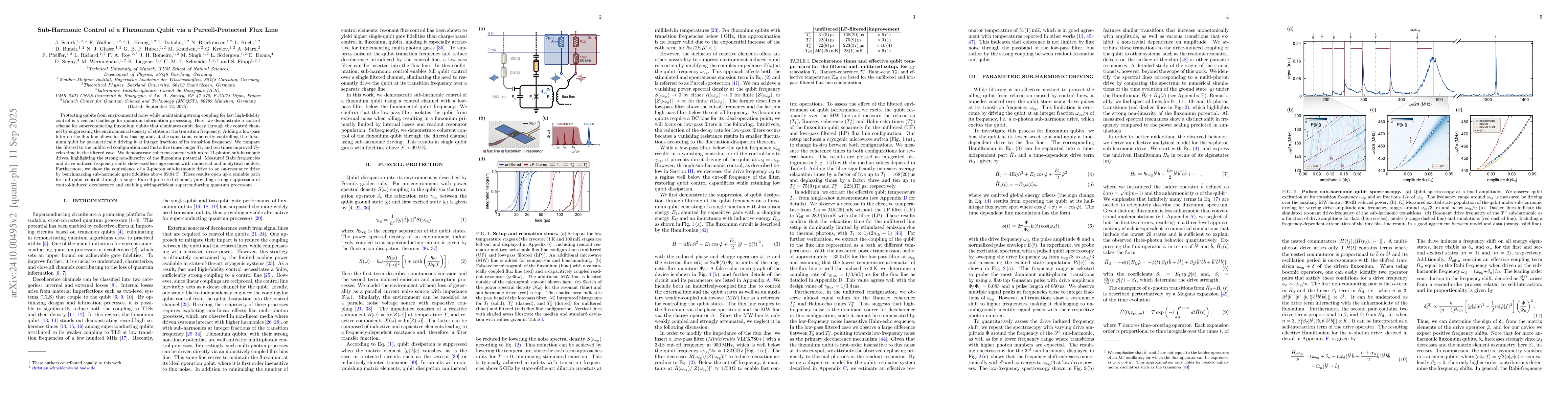Protecting qubits from environmental noise while maintaining strong coupling for fast high-fidelity control is a central challenge for quantum information processing. Here, we demonstrate a control scheme for superconducting fluxonium qubits that eliminates qubit decay through the control channel by suppressing the environmental density of states at the transition frequency. Adding a low-pass filter on the flux line allows for flux-biasing and, at the same time, coherently controlling the fluxonium qubit by parametrically driving it at integer fractions of its transition frequency. We compare the filtered to the unfiltered configuration and find a five times longer $T_1$, and ten times improved $T_2$-echo time in the filtered case. We demonstrate coherent control with up to 11-photon sub-harmonic drives, highlighting the strong non-linearity of the fluxonium potential. Measured Rabi frequencies and drive-induced frequency shifts show excellent agreement with numerical and analytical models. Furthermore, we show the equivalence of a 3-photon sub-harmonic drive to an on-resonance drive by benchmarking sub-harmonic gate fidelities above 99.94$\,$%. These results open up a scalable path for full qubit control through a single Purcell-protected channel, providing strong suppression of control-induced decoherence and enabling wiring-efficient superconducting quantum processors.