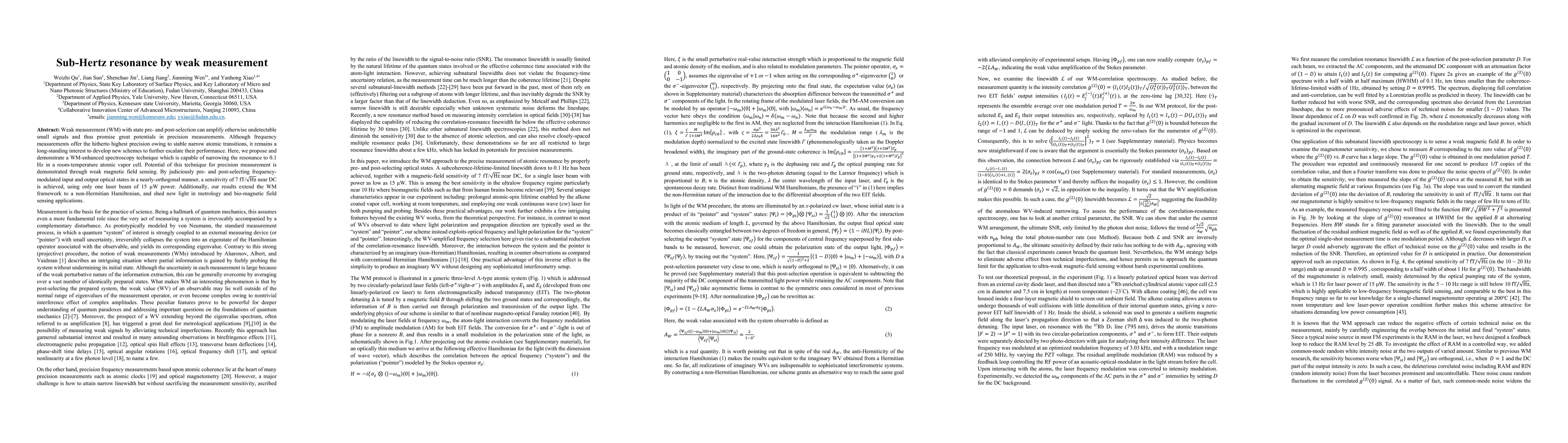Weak measurement (WM) with state pre- and post-selection can amplify otherwise undetectable small signals and thus promise great potentials in precision measurements. Although frequency measurements offer the hitherto highest precision owing to stable narrow atomic transitions, it remains a long-standing interest to develop new schemes to further escalate their performance. Here, we propose and demonstrate a WM-enhanced spectroscopy technique which is capable of narrowing the resonance to 0.1 Hz in a room-temperature atomic vapor cell. Potential of this technique for precision measurement is demonstrated through weak magnetic field sensing. By judiciously pre- and post-selecting frequency-modulated input and output optical states in a nearly-orthogonal manner, a sensitivity of $\text{7 fT/}\sqrt{\text{Hz}}$ near DC is achieved, using only one laser beam of $\text{7 }\text{\mu W}$ power. Additionally, our results extend the WM framework to a non-Hermitian Hamiltonian, and shed new light in metrology and bio-magnetic field sensing applications.