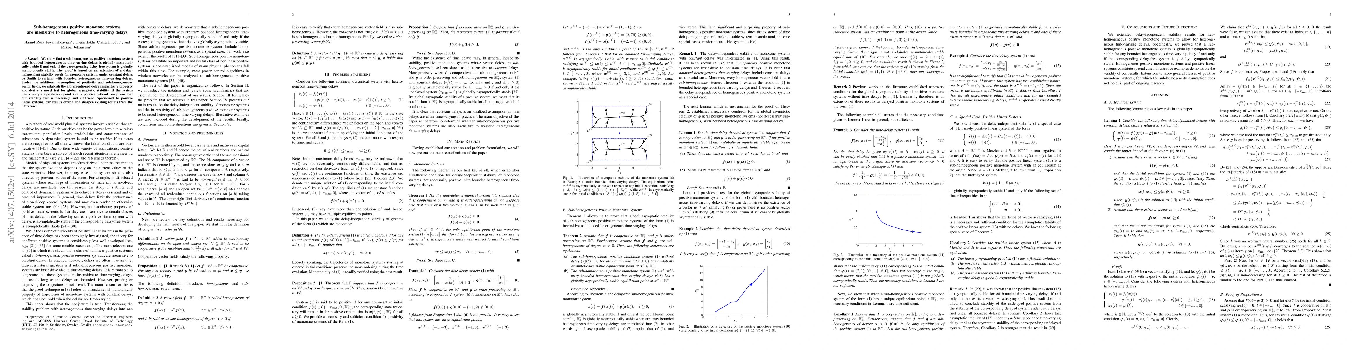 This paper demonstrates that sub-homogeneous positive monotone systems remain globally asymptotically stable despite bounded heterogeneous time-varying delays, provided the delay-free system is stable. The authors extend Smith's delay-independent stability result to these systems and provide a novel stability test.