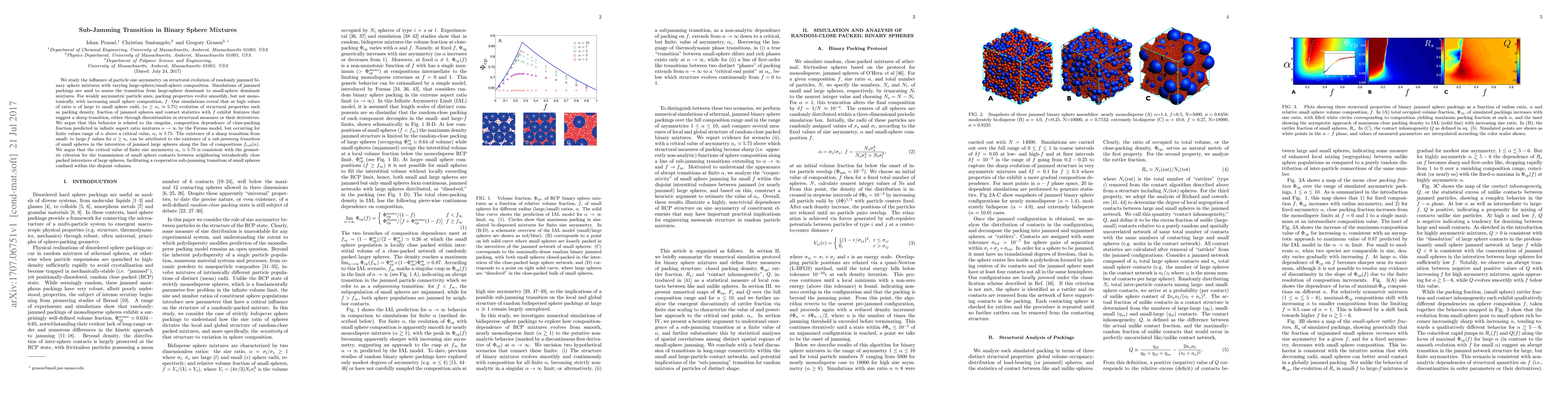 This paper investigates the structural evolution of jammed binary sphere mixtures with varying size ratios, revealing a sharp transition at a critical ratio ($\alpha_c \approx 5.75$) from large-sphere to small-sphere dominance. The study identifies a "sub-jamming transition" where small spheres become confined in the interstices of large spheres, leading to discontinuities in structural properties.