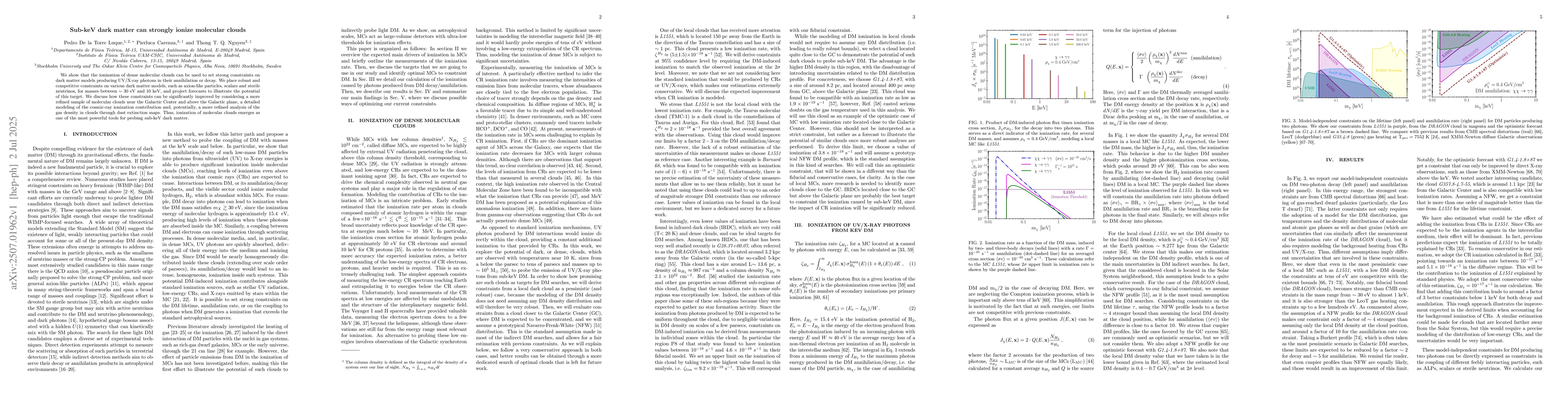 We show that the ionization of dense molecular clouds can be used to set strong constraints on dark matter models producing UV/X-ray photons in their annihilation or decay. We place robust and competitive constraints on various dark matter models, such as axion-like particles, scalars and sterile neutrinos, for masses between $\sim30$~eV and $10$~keV, and project forecasts to illustrate the potential of this target. We discuss how these constraints can be significantly improved by considering a more refined sample of molecular clouds near the Galactic Center and above the Galactic plane, a detailed modeling of the cosmic-ray ionization contribution and, potentially, a more refined analysis of the gas density in clouds through dust extinction maps. Thus, ionization of molecular clouds emerges as one of the most powerful tools for probing sub-keV dark matter.