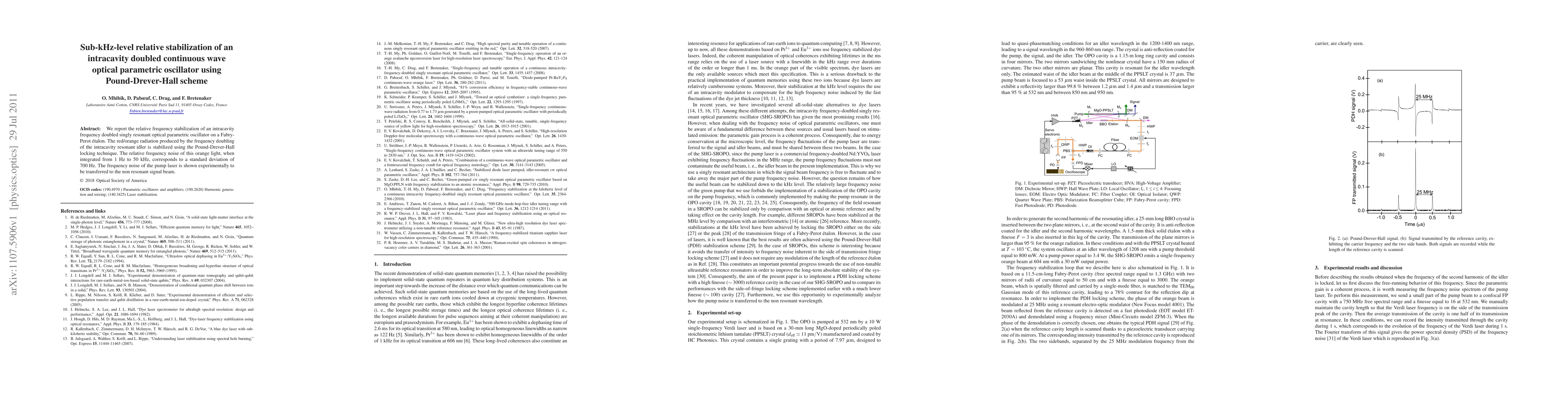 This paper details the stabilization of the frequency of intracavity doubled optical parametric oscillator radiation using the Pound-Drever-Hall technique, achieving a relative frequency noise of 700 Hz from 1 Hz to 50 kHz, while demonstrating the transfer of pump laser frequency noise to the non-resonant signal beam.