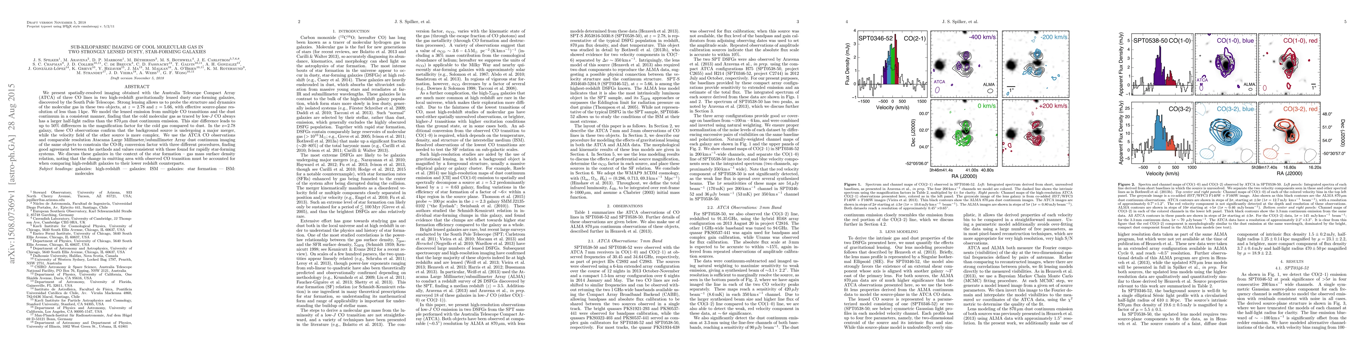 We present spatially-resolved imaging obtained with the Australia Telescope Compact Array (ATCA) of three CO lines in two high-redshift gravitationally lensed dusty star-forming galaxies, discovered by the South Pole Telescope. Strong lensing allows us to probe the structure and dynamics of the molecular gas in these two objects, at z=2.78 and z=5.66, with effective source-plane resolution of less than 1kpc. We model the lensed emission from multiple CO transitions and the dust continuum in a consistent manner, finding that the cold molecular gas as traced by low-J CO always has a larger half-light radius than the 870um dust continuum emission. This size difference leads to up to 50% differences in the magnification factor for the cold gas compared to dust. In the z=2.78 galaxy, these CO observations confirm that the background source is undergoing a major merger, while the velocity field of the other source is more complex. We use the ATCA CO observations and comparable resolution Atacama Large Millimeter/submillimeter Array dust continuum imaging of the same objects to constrain the CO-H_2 conversion factor with three different procedures, finding good agreement between the methods and values consistent with those found for rapidly star-forming systems. We discuss these galaxies in the context of the star formation - gas mass surface density relation, noting that the change in emitting area with observed CO transition must be accounted for when comparing high-redshift galaxies to their lower redshift counterparts.