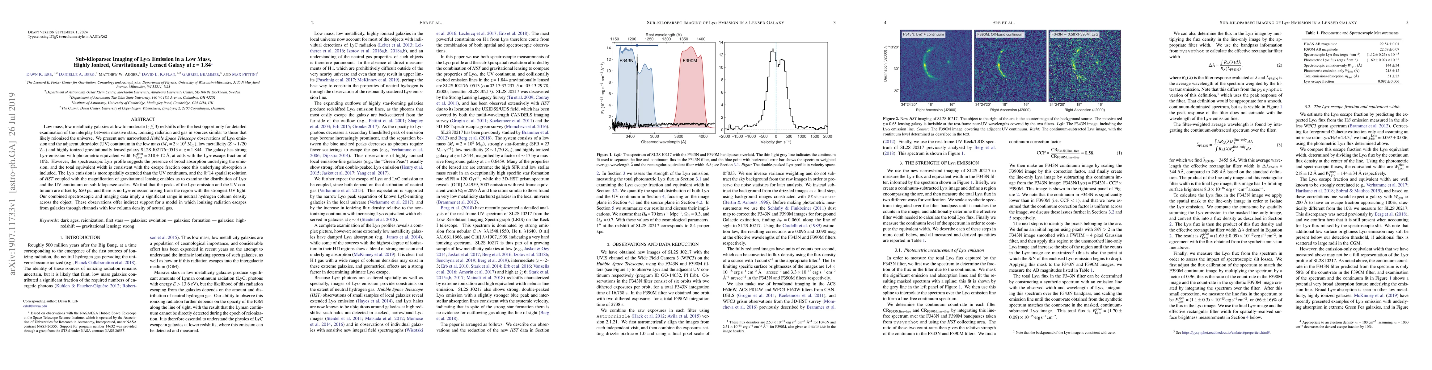This paper presents Hubble Space Telescope observations of a low mass, low metallicity, highly ionized gravitationally lensed galaxy at z=1.84, revealing strong Ly$\alpha$ emission with a large equivalent width but low escape fraction. The findings suggest significant neutral hydrogen column density variations and support models where ionizing radiation escapes through low-density gas channels.