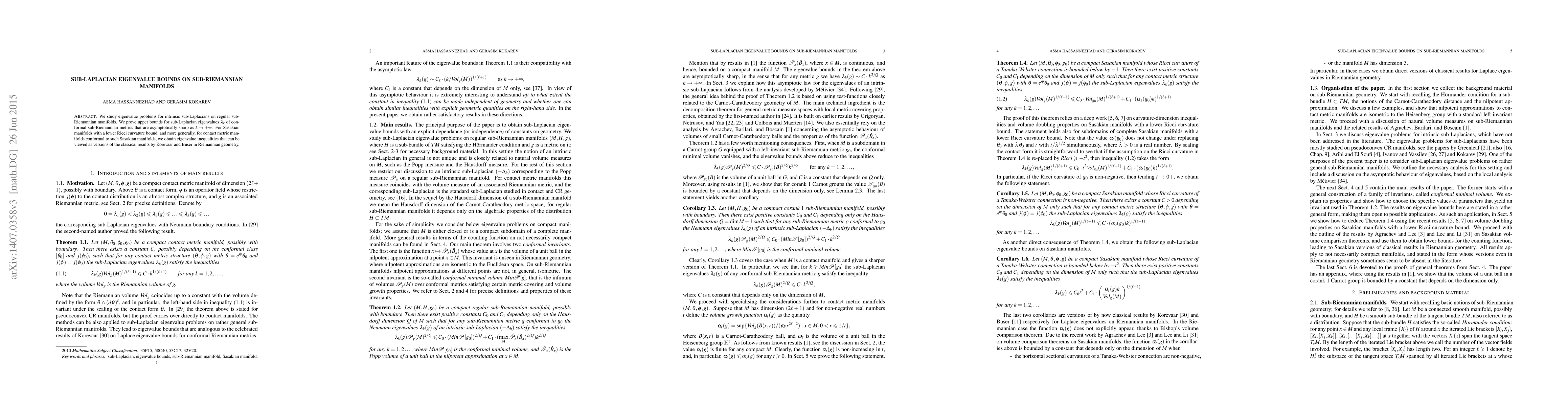 The paper investigates eigenvalue problems for sub-Laplacians on sub-Riemannian manifolds, establishing asymptotically sharp upper bounds for the eigenvalues as $k\to +\infty$. It also derives eigenvalue inequalities for Sasakian and contact metric manifolds, extending classical results from Riemannian geometry.