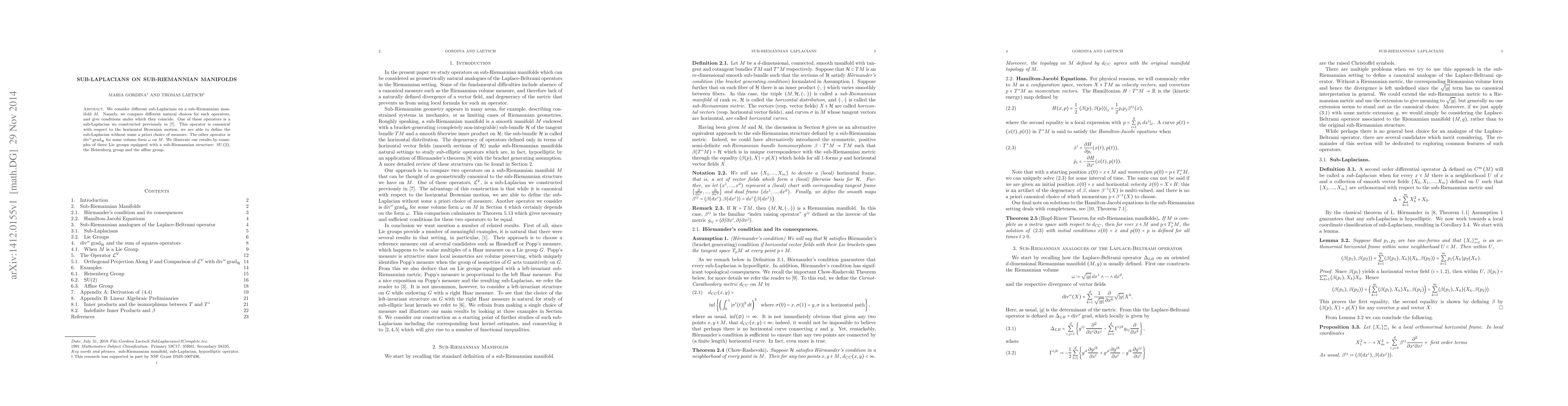 This paper compares different sub-Laplacians on sub-Riemannian manifolds, focusing on their definitions and conditions for equivalence. One operator is canonically tied to horizontal Brownian motion, while the other is derived from a volume form, with examples drawn from $\operatorname{SU}(2)$, the Heisenberg group, and the affine group.