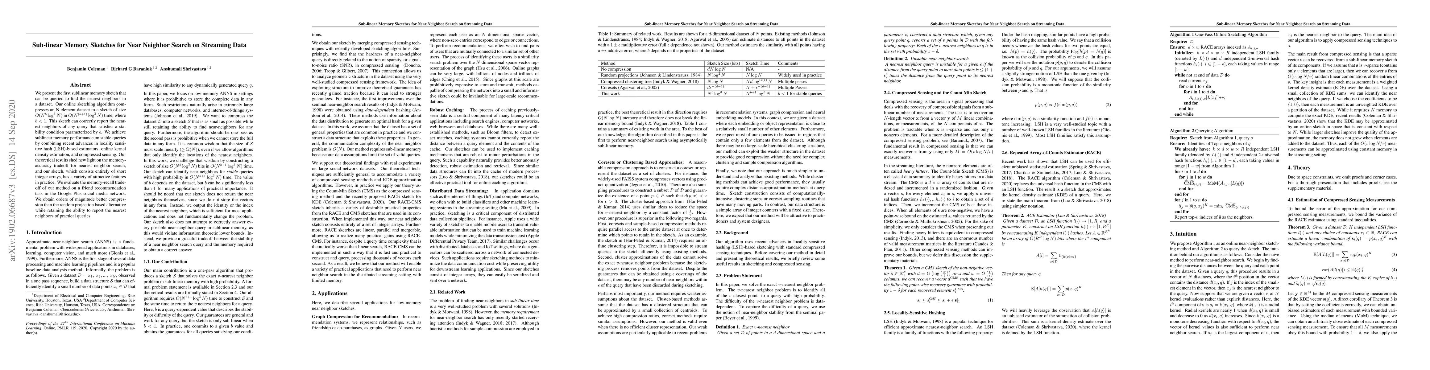 We present the first sublinear memory sketch that can be queried to find the nearest neighbors in a dataset. Our online sketching algorithm compresses an N element dataset to a sketch of size $O(N^b \log^3 N)$ in $O(N^{(b+1)} \log^3 N)$ time, where $b < 1$. This sketch can correctly report the nearest neighbors of any query that satisfies a stability condition parameterized by $b$. We achieve sublinear memory performance on stable queries by combining recent advances in locality sensitive hash (LSH)-based estimators, online kernel density estimation, and compressed sensing. Our theoretical results shed new light on the memory-accuracy tradeoff for nearest neighbor search, and our sketch, which consists entirely of short integer arrays, has a variety of attractive features in practice. We evaluate the memory-recall tradeoff of our method on a friend recommendation task in the Google Plus social media network. We obtain orders of magnitude better compression than the random projection based alternative while retaining the ability to report the nearest neighbors of practical queries.