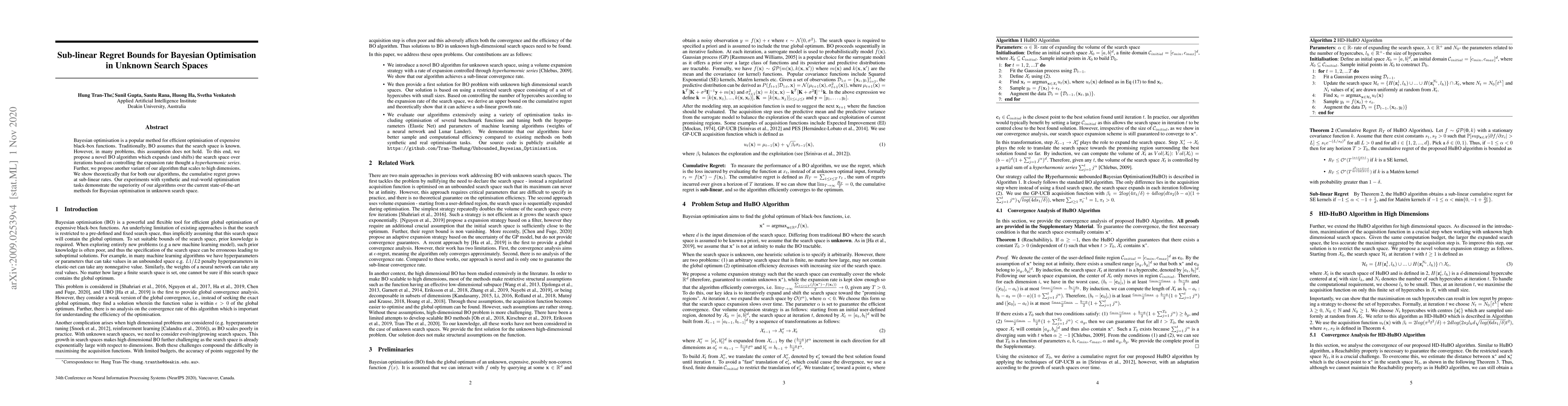 This paper introduces a novel Bayesian optimisation algorithm for unknown search spaces, which dynamically adjusts the search space through an expansion rate controlled by a hyperharmonic series. The authors demonstrate sub-linear regret bounds for their algorithms and show superior performance over existing methods in both synthetic and real-world optimisation tasks.