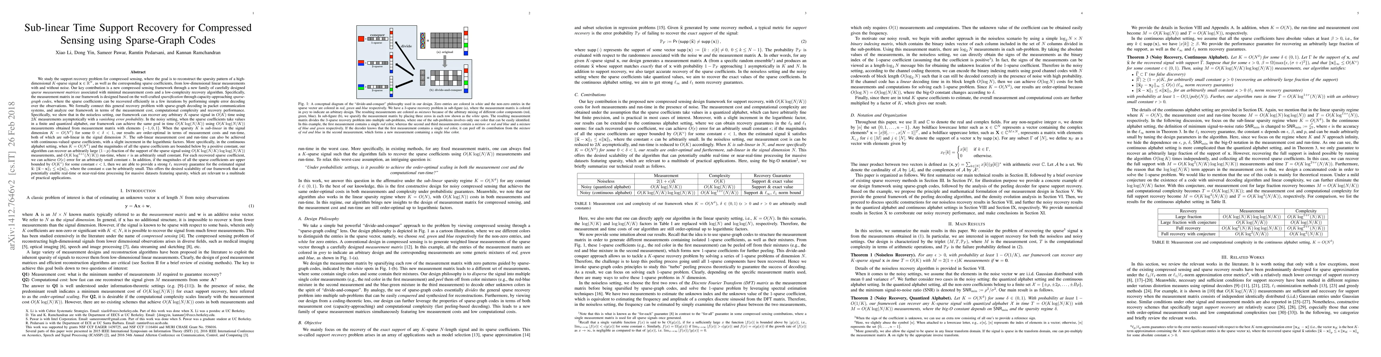 This paper presents a new compressed sensing framework using sparse-graph codes for efficient support recovery, achieving sub-linear time complexity and measurement costs. The proposed method can recover $K$-sparse signals in $O(K)$ time with $2K$ measurements in noiseless settings, and in $O(K\log(N/K))$ time with $O(K\log(N/K))$ measurements in noisy settings, both with sub-linear scalability relative to the signal dimension.