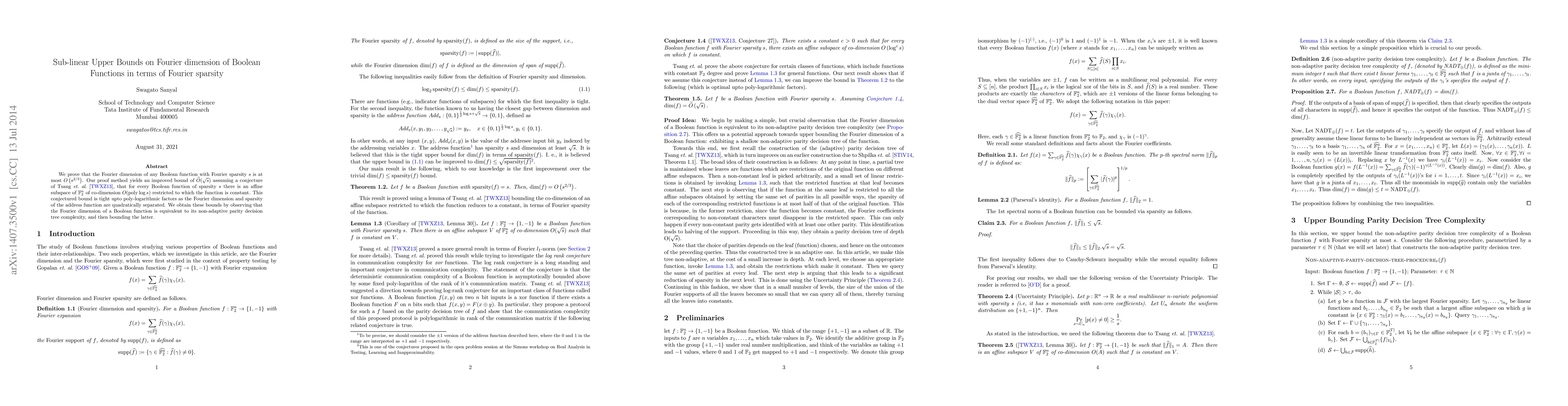 We prove that the Fourier dimension of any Boolean function with Fourier sparsity $s$ is at most $O\left(s^{2/3}\right)$. Our proof method yields an improved bound of $\widetilde{O}(\sqrt{s})$ assuming a conjecture of Tsang~\etal~\cite{tsang}, that for every Boolean function of sparsity $s$ there is an affine subspace of $\mathbb{F}_2^n$ of co-dimension $O(\poly\log s)$ restricted to which the function is constant. This conjectured bound is tight upto poly-logarithmic factors as the Fourier dimension and sparsity of the address function are quadratically separated. We obtain these bounds by observing that the Fourier dimension of a Boolean function is equivalent to its non-adaptive parity decision tree complexity, and then bounding the latter.