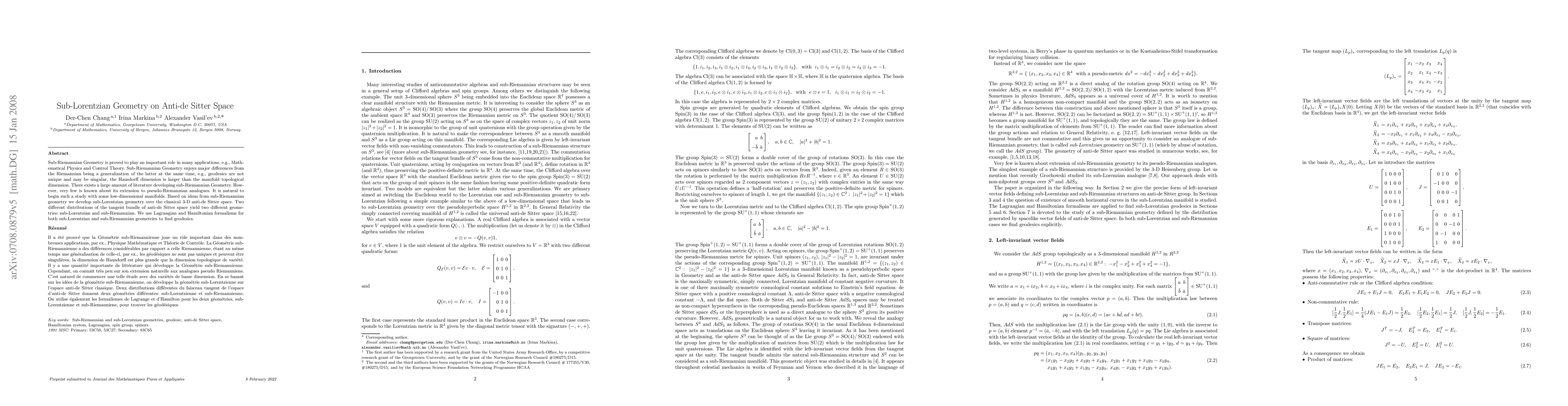 Sub-Riemannian Geometry is proved to play an important role in many applications, e.g., Mathematical Physics and Control Theory. The simplest example of sub-Riemannian structure is provided by the 3-D Heisenberg group. Sub-Riemannian Geometry enjoys major differences from the Riemannian being a generalisation of the latter at the same time, e.g., geodesics are not unique and may be singular, the Hausdorff dimension is larger than the manifold topological dimension. There exists a large amount of literature developing sub-Riemannian Geometry. However, very few is known about its natural extension to pseudo-Riemannian analogues. It is natural to begin such a study with some low-dimensional manifolds. Based on ideas from sub-Riemannian geometry we develop sub-Lorentzian geometry over the classical 3-D anti-de Sitter space. Two different distributions of the tangent bundle of anti-de Sitter space yield two different geometries: sub-Lorentzian and sub-Riemannian. It is shown that the set of timelike and spacelike `horizontal' curves is non-empty and we study the problem of horizontal connectivity in anti-de Sitter space. We also use Lagrangian and Hamiltonian formalisms for both sub-Lorentzian and sub-Riemannian geometries to find geodesics.